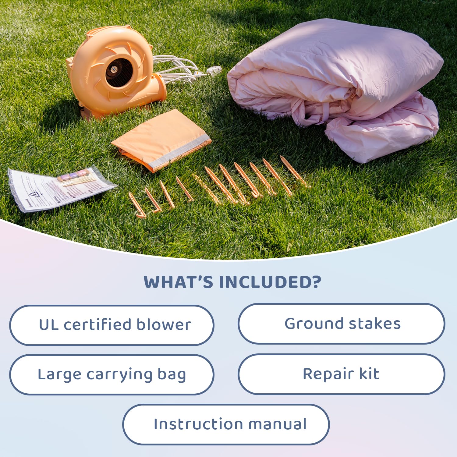 - PRODUCT DETAILS : Inflated size: 16.4ft x 13.1ft x 9.3ft H, Package includes: bounce house, blower, carry bag, stakes, repair kit and instruction. Weight limit: Max weight: 500 lbs, Max individual weight: 100 lbs. Max number of kids: 5. Please follow our weight limit recommendations to ensure the safety and longevity of your inflatable. Easy set up and take down, inflates in less than a minute. Perfect for indoor and outdoor use. Carry bag provides easy portability.
