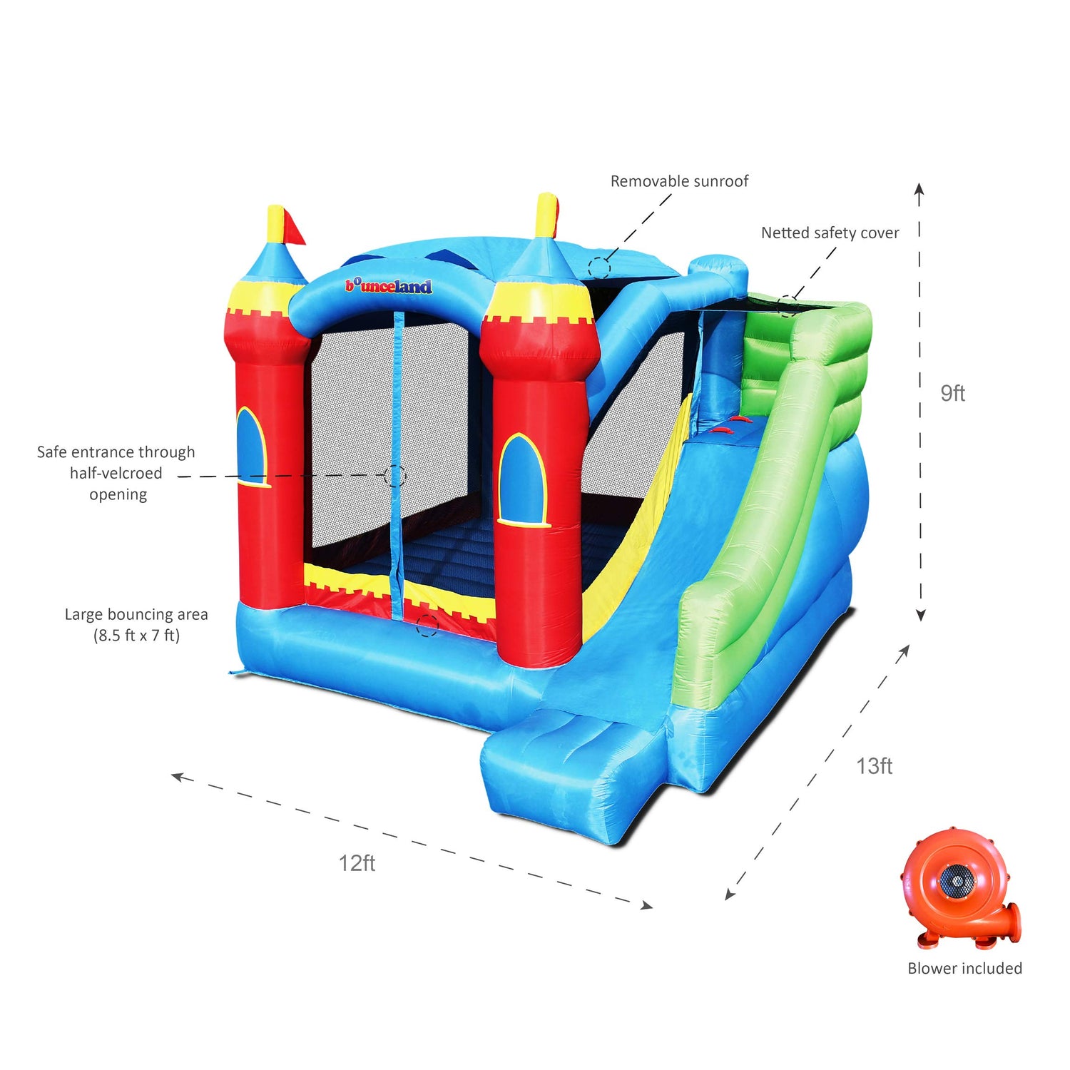 Bounceland Royal Palace Inflatable Bounce House, with Long Slide, Large Bouncing Area, Basketball Hoop and Sun Roof, 13 ft x 12 ft x 9 ft H, UL Strong Certified Blower, Castle Kids Party Theme