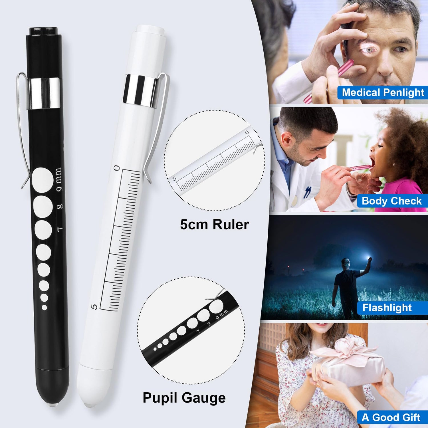 - LED Nurse Penlights: The LED penlights is made of aluminum alloy and led bulbs, the medical light with pupil gauge and ruler, The design of the metal pen clip can be clamped on the pocket or notebook, the medical penlight also comes with 4 AAA batteries. 4 Self-adhesive bandages are made of porous fabric and non-woven material with good ventilation.