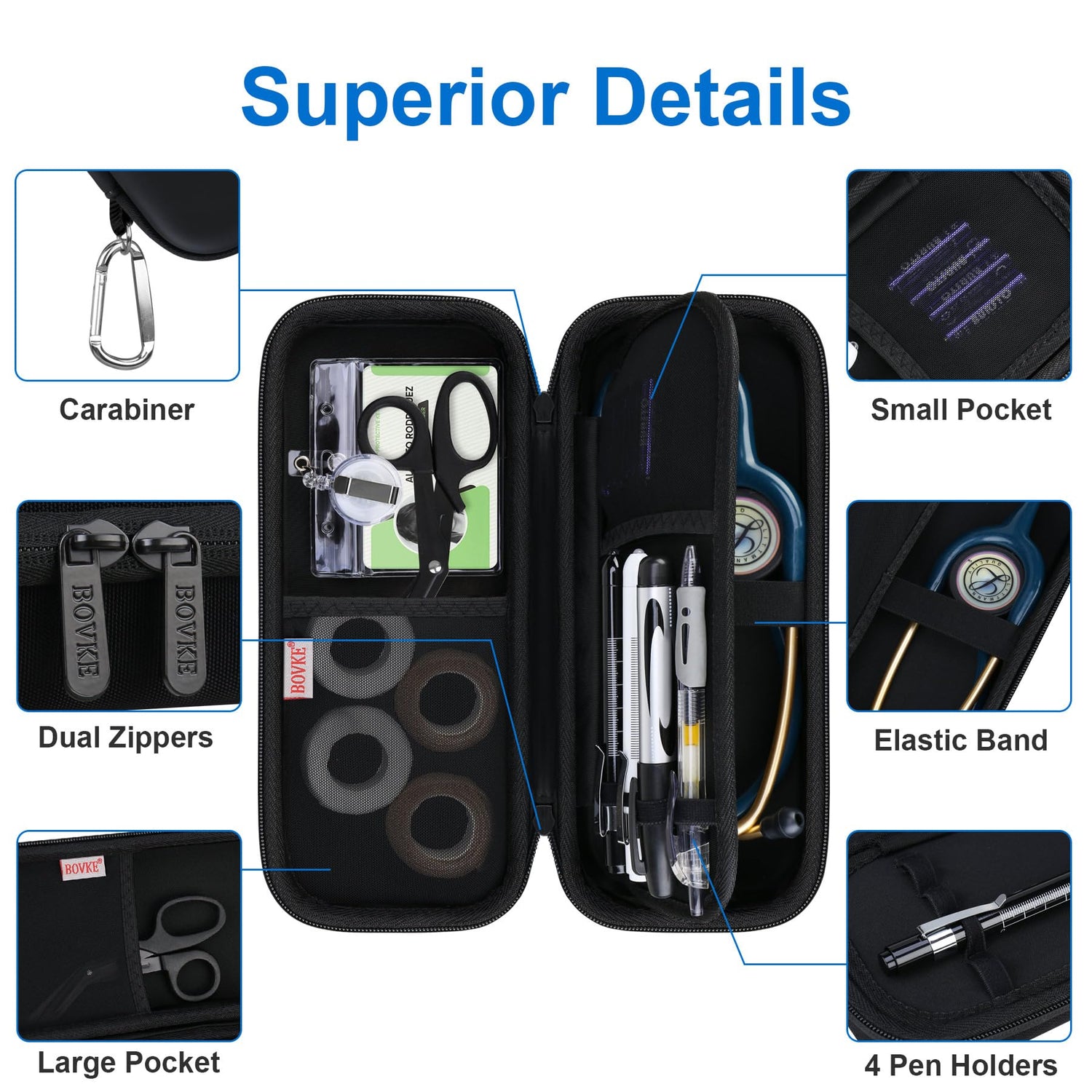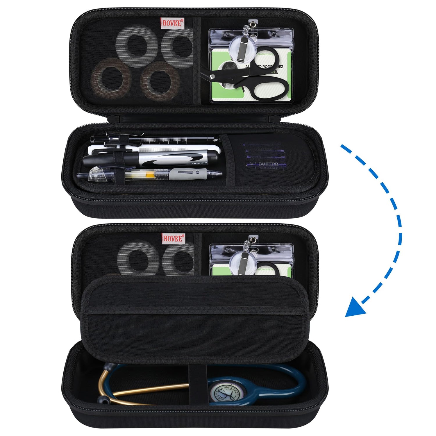 - This stethoscope bag is compatible with 3M Littmann stethoscopes and a variety of nurse accessories, large capacity for nursing supplies, hard EVA material with extra soft lining, this stethoscope case is shockproof, water-resistant, provides long-term performance. the stethoscope holder comes with double zippers, safely keep your nurse stethoscope pack.