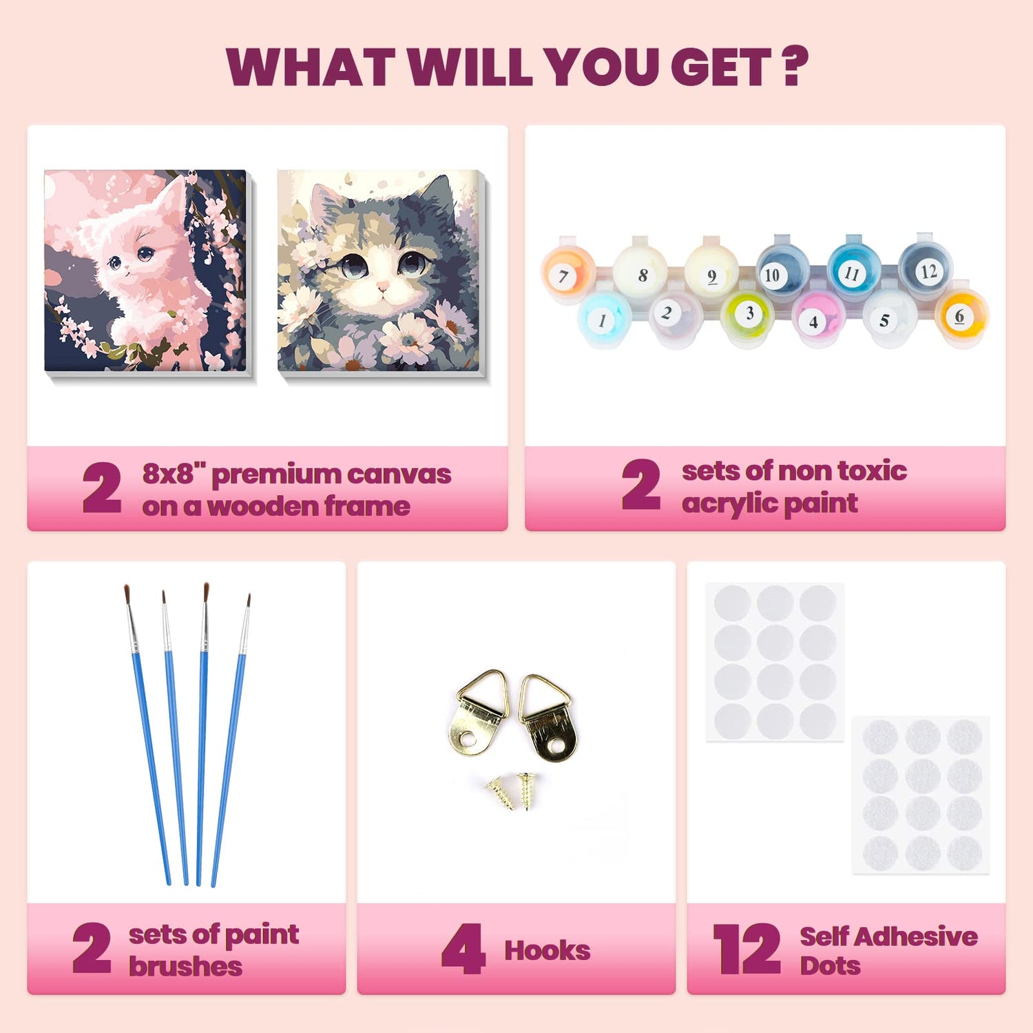 Bowetile 2 Pack Cat Paint by Numbers for Adults Beginners Framed, Adults' Paint-by-Number Cat Kits, Easy Adult Paint by Number Kits on Canvas, Acrylic Number Painting for Home Decor, 8x8in