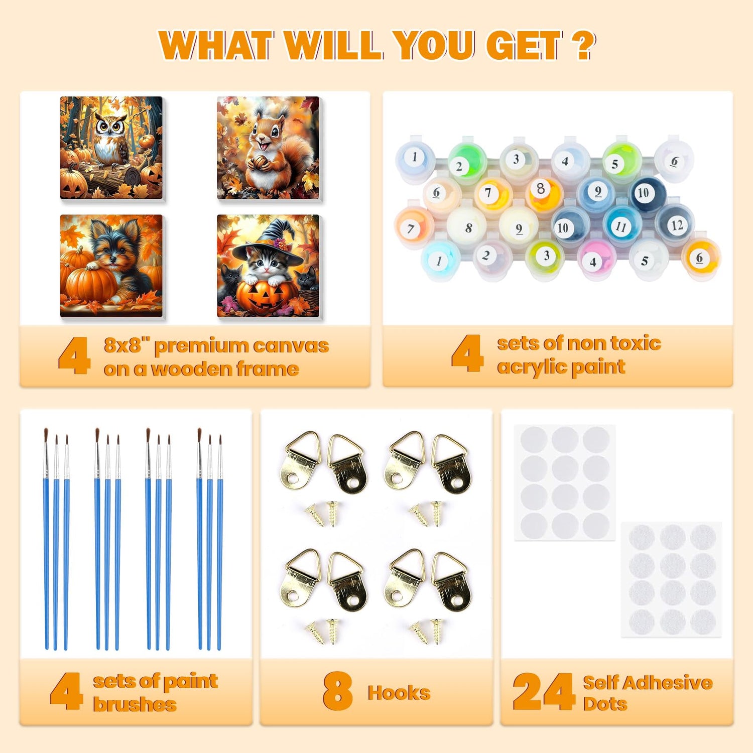 Bowetile 4 Pack Fall Framed Paint by Numbers for Adults Beginners, Easy Adults' Paint-by-Number Kits on Canvas, Acrylic Animals Number Painting Crafts Kits Halloween Gifts for Home Decor, 8x8in