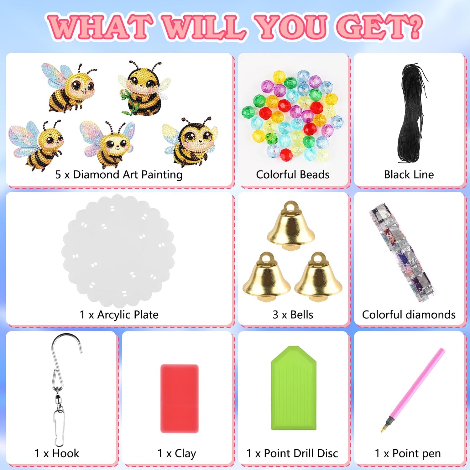 - What You Will Get: Bowetile diamond art wind chimes kit includes: Double-sided diamond painting bee x 5, bell x 3, colorful beads x 1pack, acrylic sheet x 1, String and diamond painting tool kit. All necessary tools are packed in an exquisite box