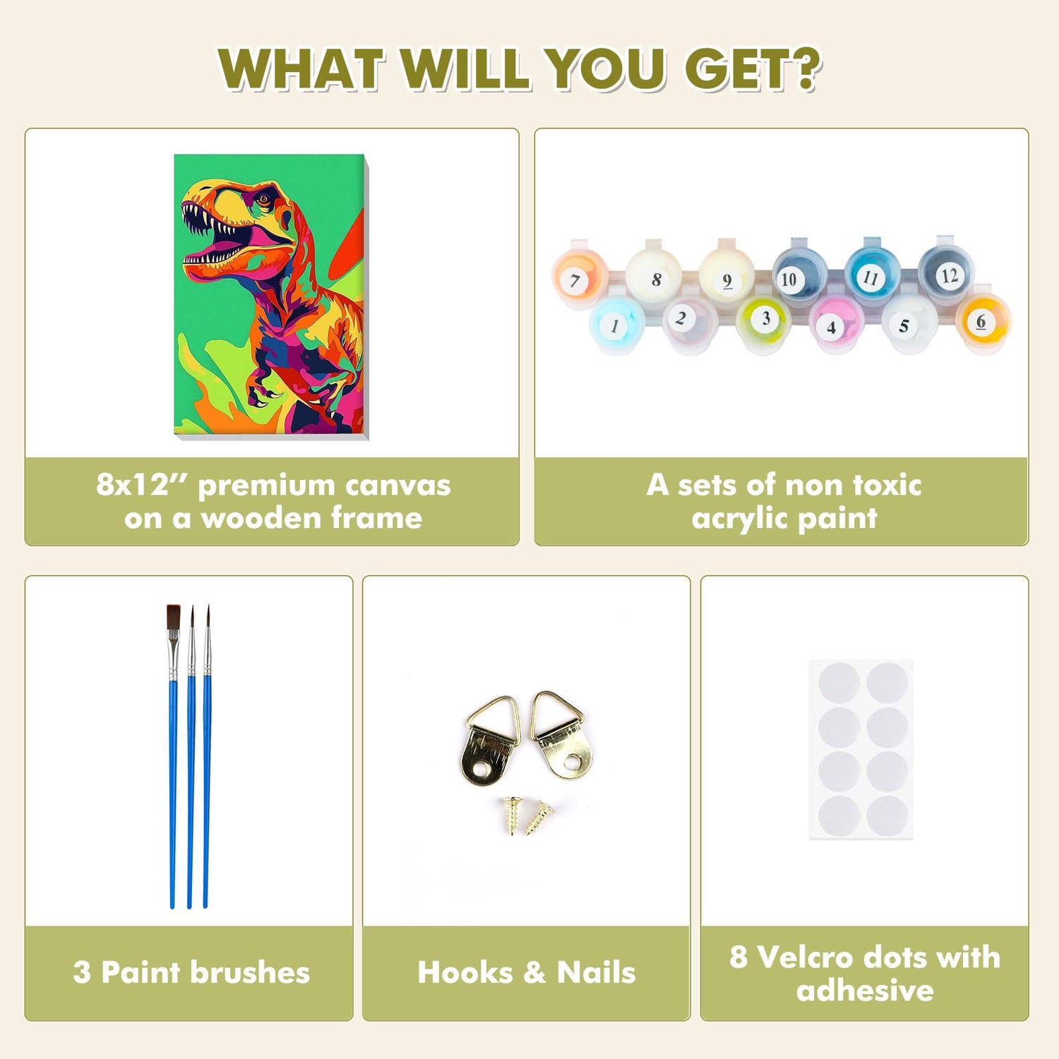 - What You Will Get: Each paint by number kit includes a wooden frame canvas, and 3 brushes with different tips. Hang their masterpiece with ease using the included Hooks or Self Adhesive Dots for stunning wall decor