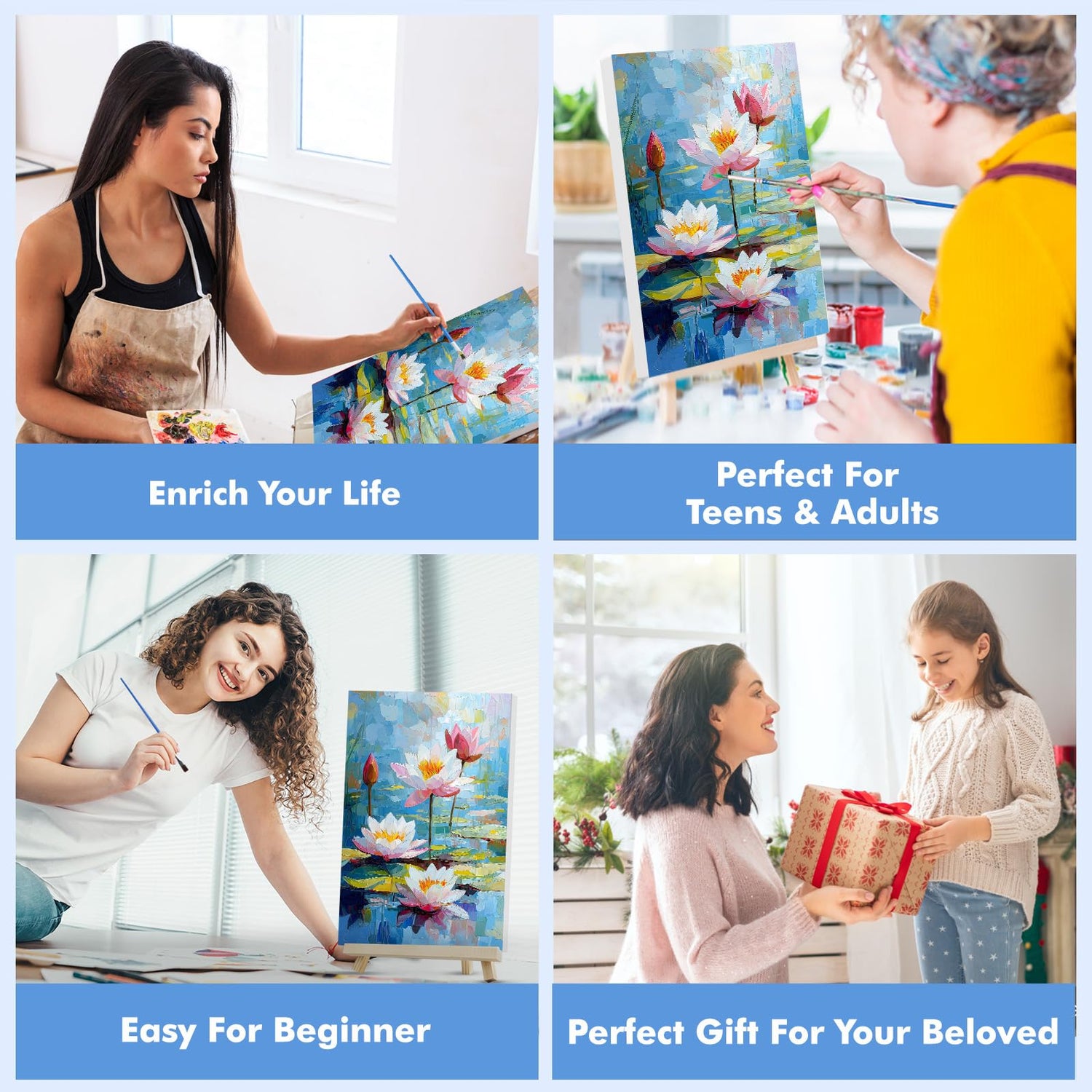 Bowetile Framed Paint by Numbers for Adults Beginners with Wooden Easel, Flowers Lotus Adults' Paint-by-Number Kits on Canvas, Easy DIY Acrylic Number Painting for Home Decor Birthday Gifts, 8x12in