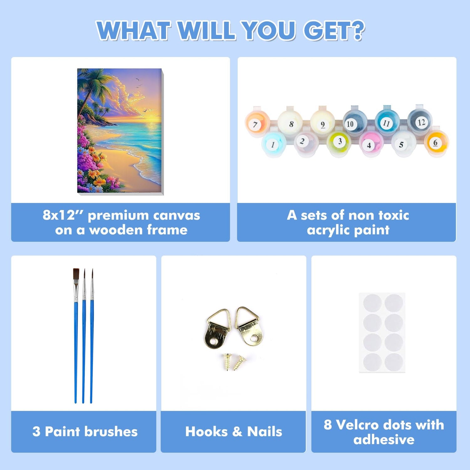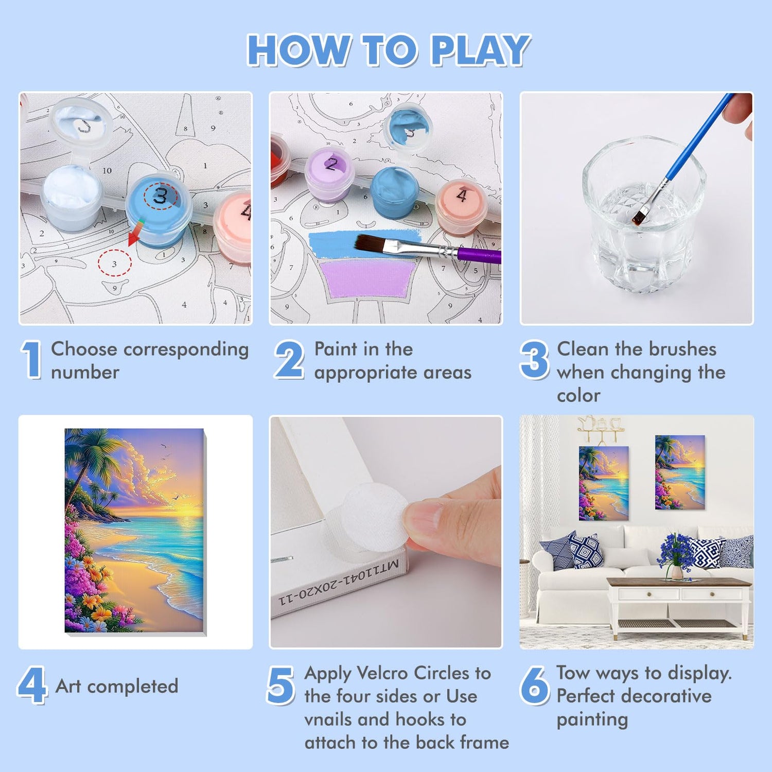 - What You Will Get: Each paint by number kit includes a wooden frame canvas, and 3 brushes with different tips. Hang their masterpiece with ease using the included Hooks or Self Adhesive Dots for stunning wall decor