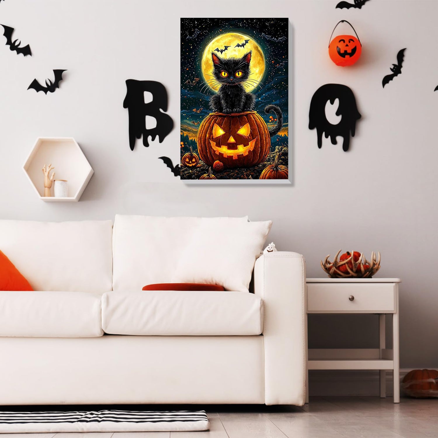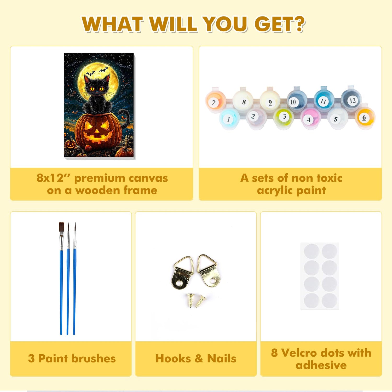 Bowetile Halloween Framed Paint by Numbers for Adults Beginners, Easy Adults' Paint-by-Number Black Cat Kits on Canvas, Acrylic Number Painting Crafts Kits Halloween Gifts for Home Decor, 8x12in