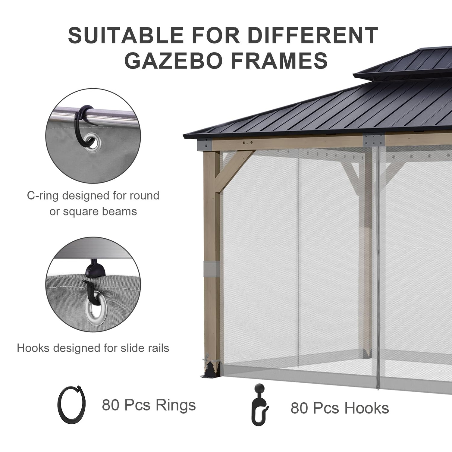 • Easy Installation: The package comes with C-shaped rings and hooks, allowing for hassle-free attachment to different gazebo beams for quick and easy setup