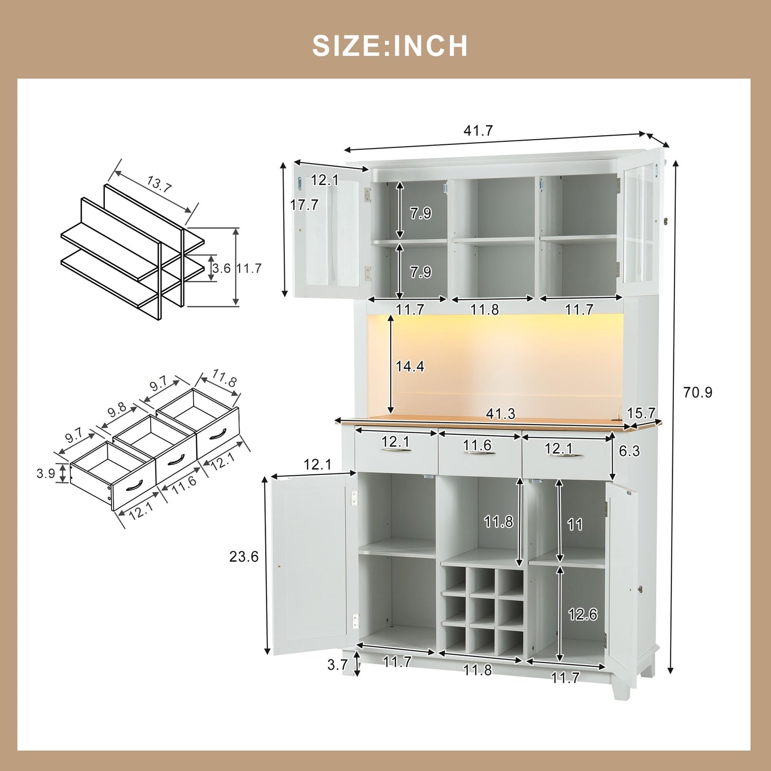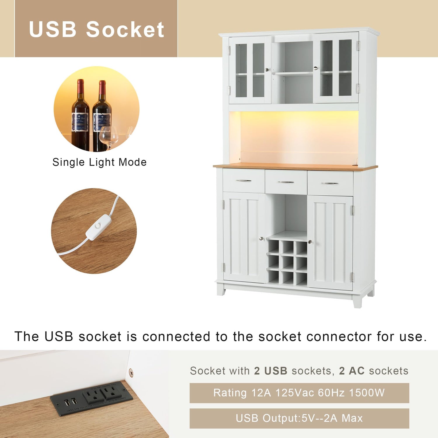 Brabrety Farmhouse 70'' Kitchen Pantry Storage Buffet Cabinet with LED Outlet,Tall Kitchen Hutch Cabinet with Wine Glass Racks and 3 Drawers,for Home Dining Room Living Room (White@Outlet)