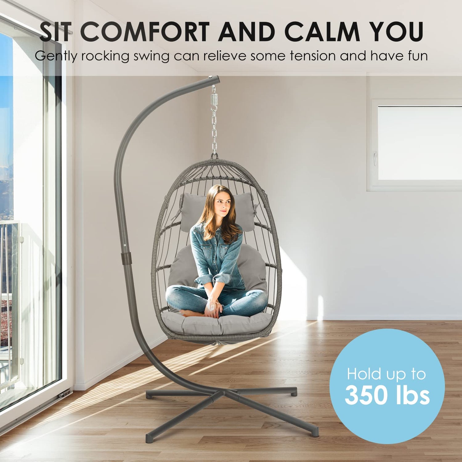 - Package: The hanging chair includes one egg hammock chair, one hook, one stand, one cushion, one pillow, and an accessories tool bag. You don’t have to buy anything else to get this full chair. If any pieces are missed, just contact us any time and we will send you the replacement at once.