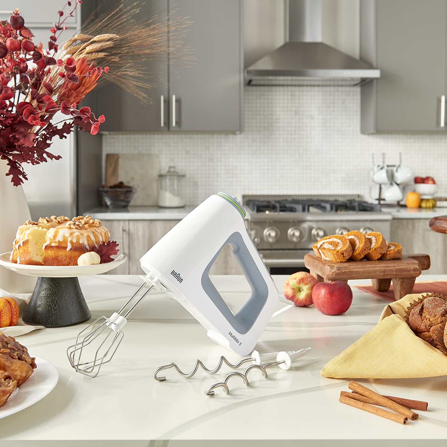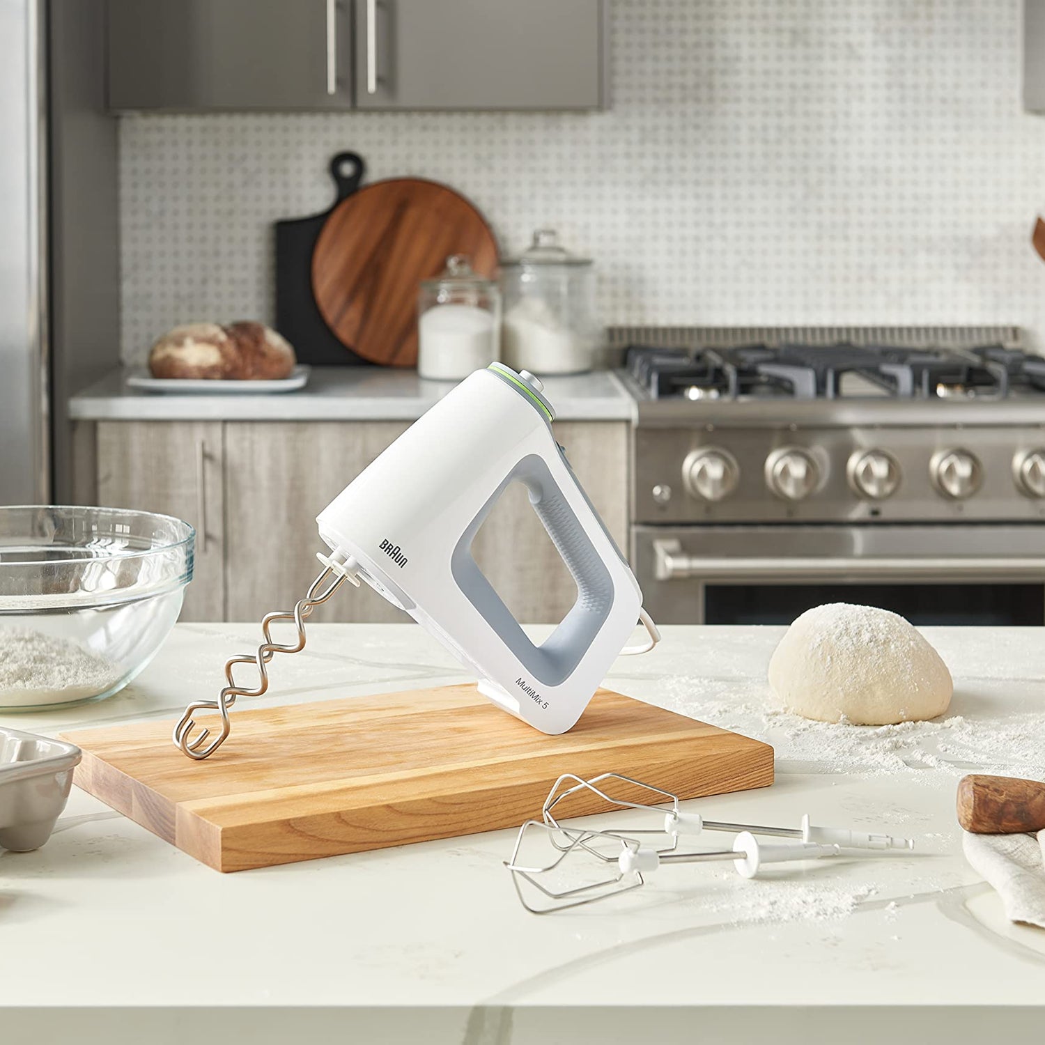 Details: The MultiMix 5 Hand mixer delivers 50% more power* than leading competitors. With its 350-watt motor, you can beat, whisk, and knead even the toughest ingredients for your favorite recipes with excellent results. Braun’s SmartMix technology redistributes the weight of the mixer out of your hand and into the bowl, cutting your effort in half. A completely sealed design prevents anything from getting into the housing for quick, easy cleanup and long-lasting performance. The one-touch VarioControl speed dial lets you fine-tune your mixing with 9 speeds plus Turbo for your toughest ingredients. The unique MultiWhisk attachment is both whisk and beater in one. Its dual-action design creates volume for light, airy mixtures. Homemade bread is no challenge for this mixer with its included sturdy dough hooks. With signature Braun design and engineering, you'll love the lightweight comfort and control of the soft-grip, slip-resistant handle. So let the baking begin! *Wattage and mixing effort (mixing cake batter, external tests) compared to leading competitors