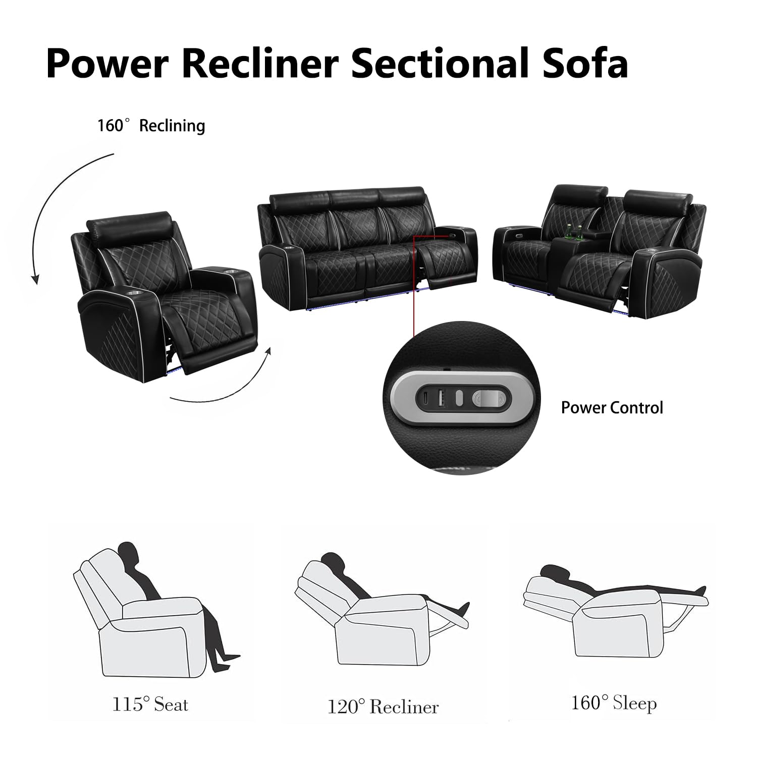 Breathing Leather Power Recliner Sofa Set Living Room Furniture Reclining Couch with LED Light/Cup Holder/USB Ports for Home Theater (3 Piece Leather Couch, Black)
