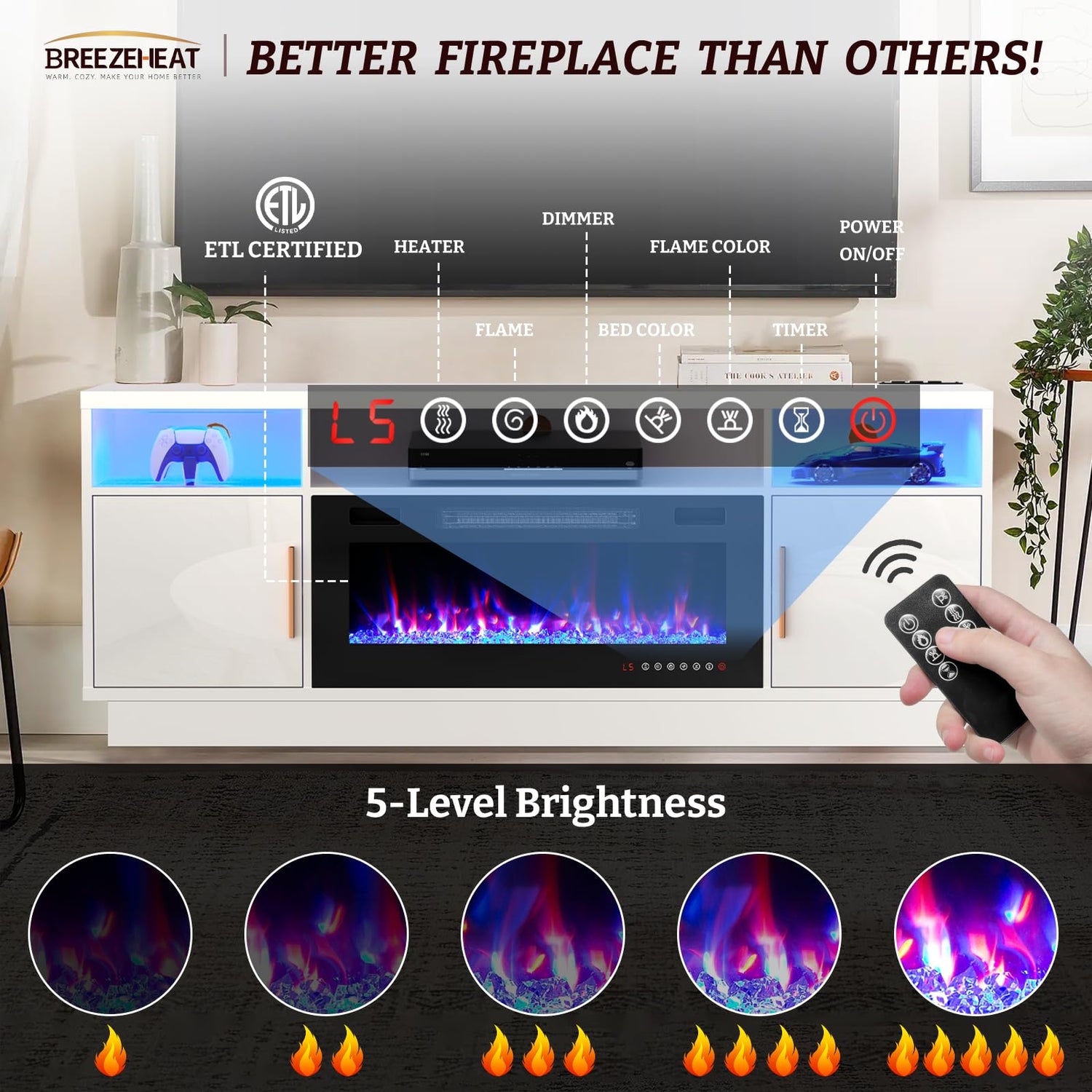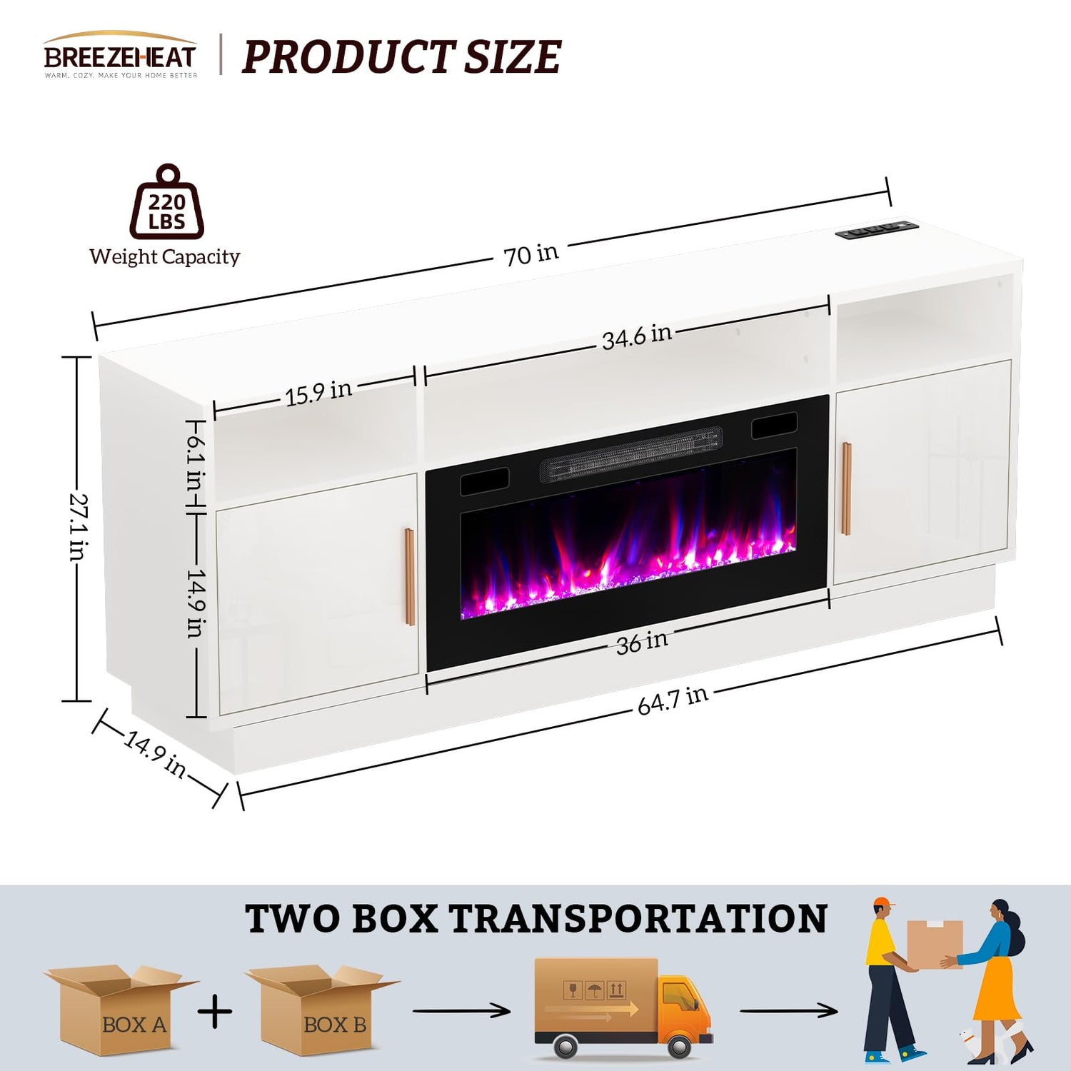 BREEZEHEAT Electric Fireplace TV Stand-Led Entertainment Center-70 inch TV Stand with 36" Electric Fireplace-Living Room Tv Cabinet with Storage for TVs Up to 80",Modern Media Console (White)