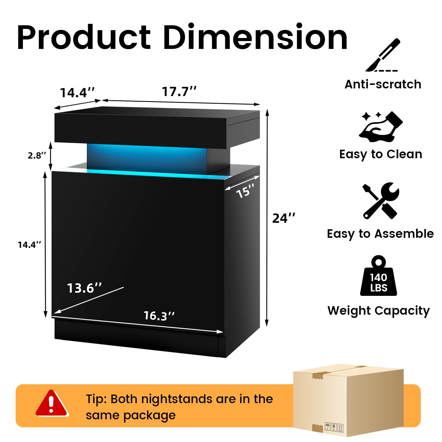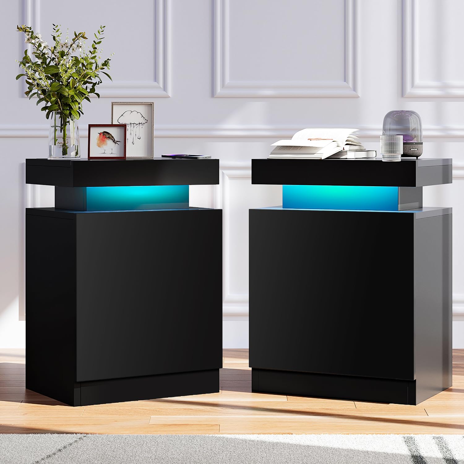 Breezestival 17" Nightstand with LED Lights Set of 2, Night Stand Bedside Table with Open Compartment, Modern End Side Table with Storage for Bedroom, Black