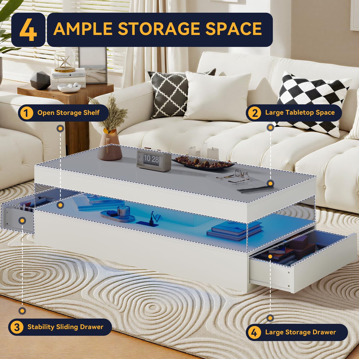 Breezestival 47" High-Glossy LED Coffee Table with 2 Sliding Drawers, Living Room Storage Coffee Tables, Modern Stylish Double-Layer Center Tables with LED Lights, White