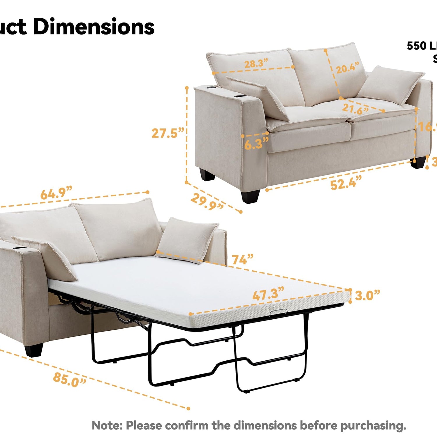 Brelice Pull Out Sofa Bed, Chenille Sleeper Couch with Memory Foam Mattress, 2-in-1 Convertible Sofa Solid Wood Slats Support, 2-Seat Loveseat for Living Room Home Office Apartment, Full Size, Beige