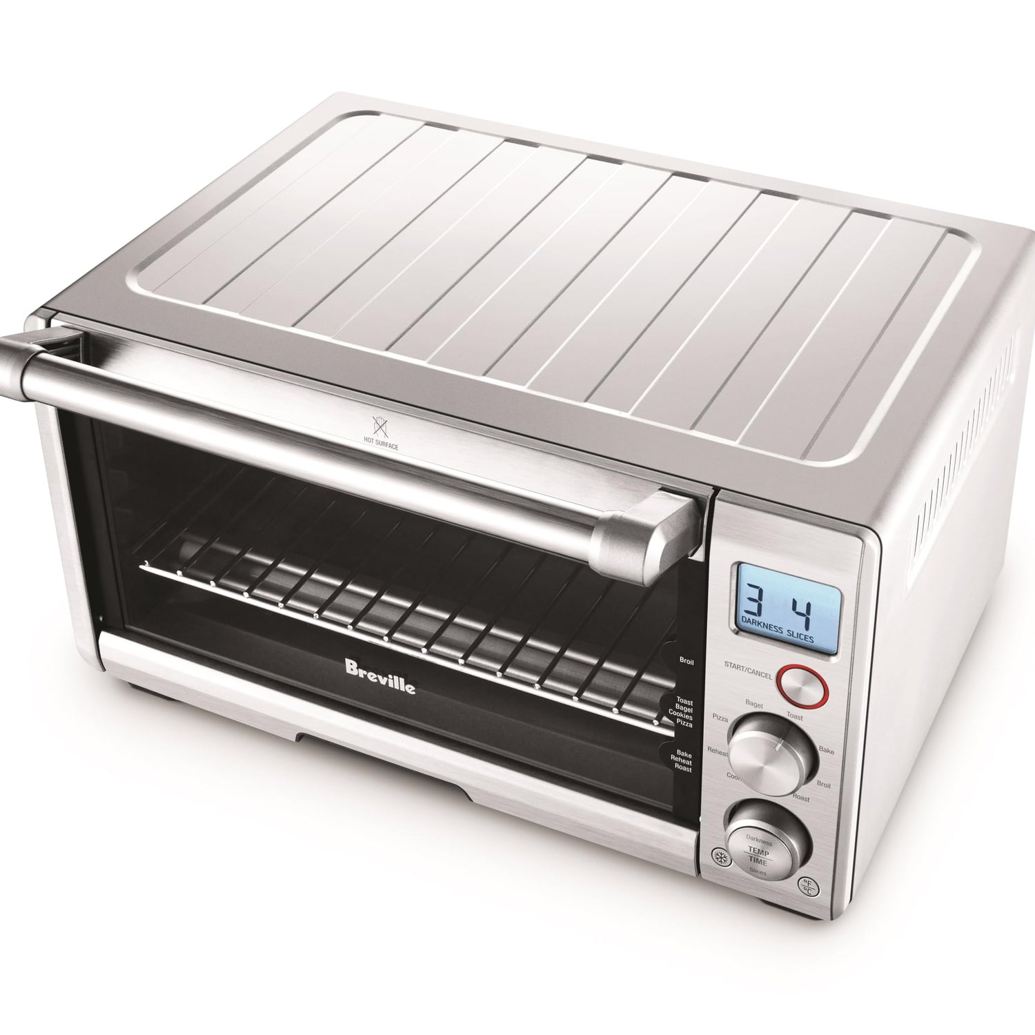 Details: Similar to the Breville Smart Oven, but in a smaller, more compact design, this 1800-watt oven offers exceptional cooking convenience while taking up less space on the counter. The unit's 3/5-cubic-foot nonstick interior can accommodate a 12-inch pizza or four slices of bread at a time, while its push-button and turn-knob control panel makes it easy to program. Turn the control dial to select the function--options include Toast, Bagel, Bake, Roast, Broil, Pizza, Cookies, and Reheat. The oven's Element IQ "smart" sensor technology puts the power where it's needed most to ensure energy-efficient operation. For each of the eight pre-set functions, Element IQ automatically adjusts the power and calculates the cooking time. The time and temperature for the pre-set programs can also be manually adjusted to accommodate individual preferences--the oven will even remember the new settings for next time. Use the second control dial for setting the time (from one minute up to two hours) and for adjusting the temperature (from 120 to 450 degrees F), as well as for selecting the number of slices and for setting the toast shade, from light to dark. The control panel also offers a large start/cancel button, a defrost button for frozen foods, and a temperature-conversion button for recipes with cooking temperatures in Celsius. The oven's easy-to-read backlit LCD screen shows the current function, temperature, and adjustments made--plus it illuminates orange to indicate preheating and cooking, then blue to indicate the end of the cooking cycle. Other highlights include a tempered-glass door, three rack positions, and a front-access removable crumb tray for quick cleanup. Accessories include a 10-by-10-inch enamel baking pan and a 10-by-10-inch enamel broil rack. Attractively housed in coated steel with a strikingly modern design, the countertop oven measures 16-1/2 by 14-1/4 by 10 inches and carries a one-year limited warranty.