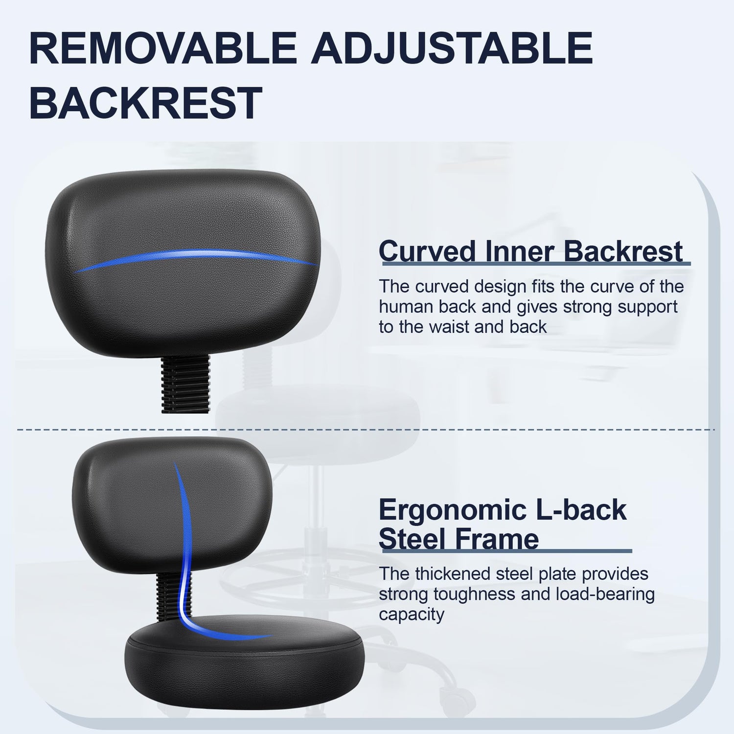 - Ergonomic Detachable Backrest: The PU leather backrest of this standing chair can be removed as needed. The curved backrest design is ergonomic. The thickened backrest steel plate provides strong toughness and load-bearing capacity