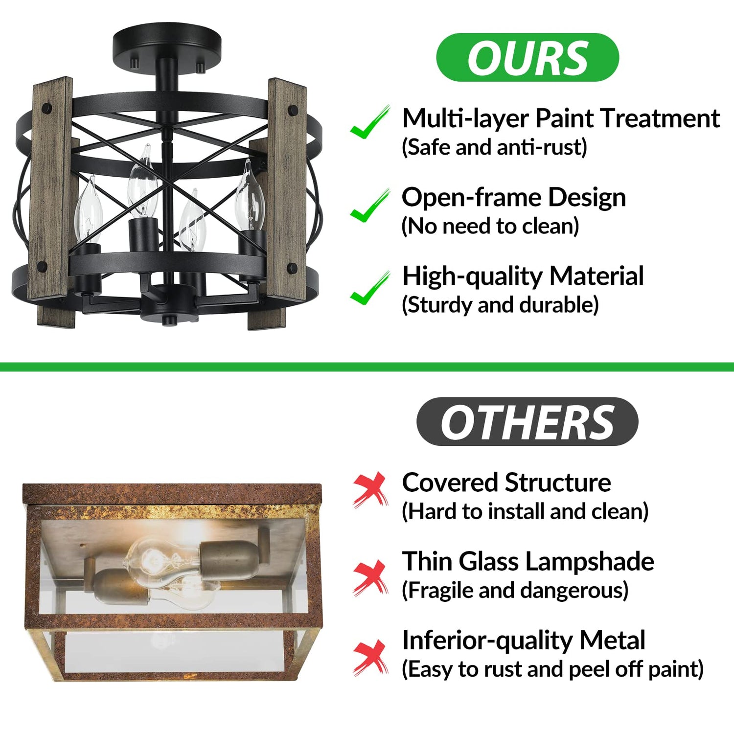 - 【Durable for Use & Anti-rust】The close to ceiling light fixture is made of high-strength metal with a stable structure, much more durable for long term usage. Covered with black and wood grain paint, the dining room light fixture will surely maintain its farmhouse appearance for many years without fading, rusting or corroding