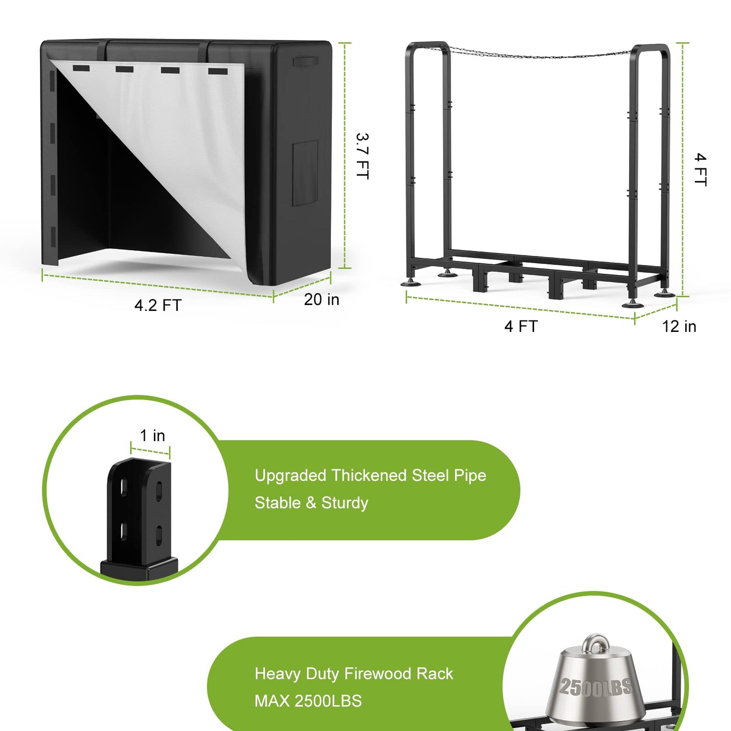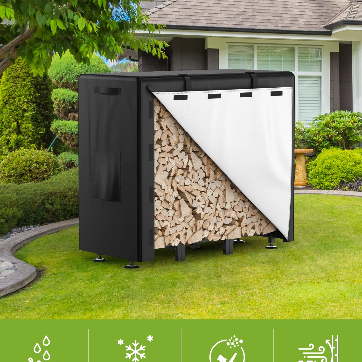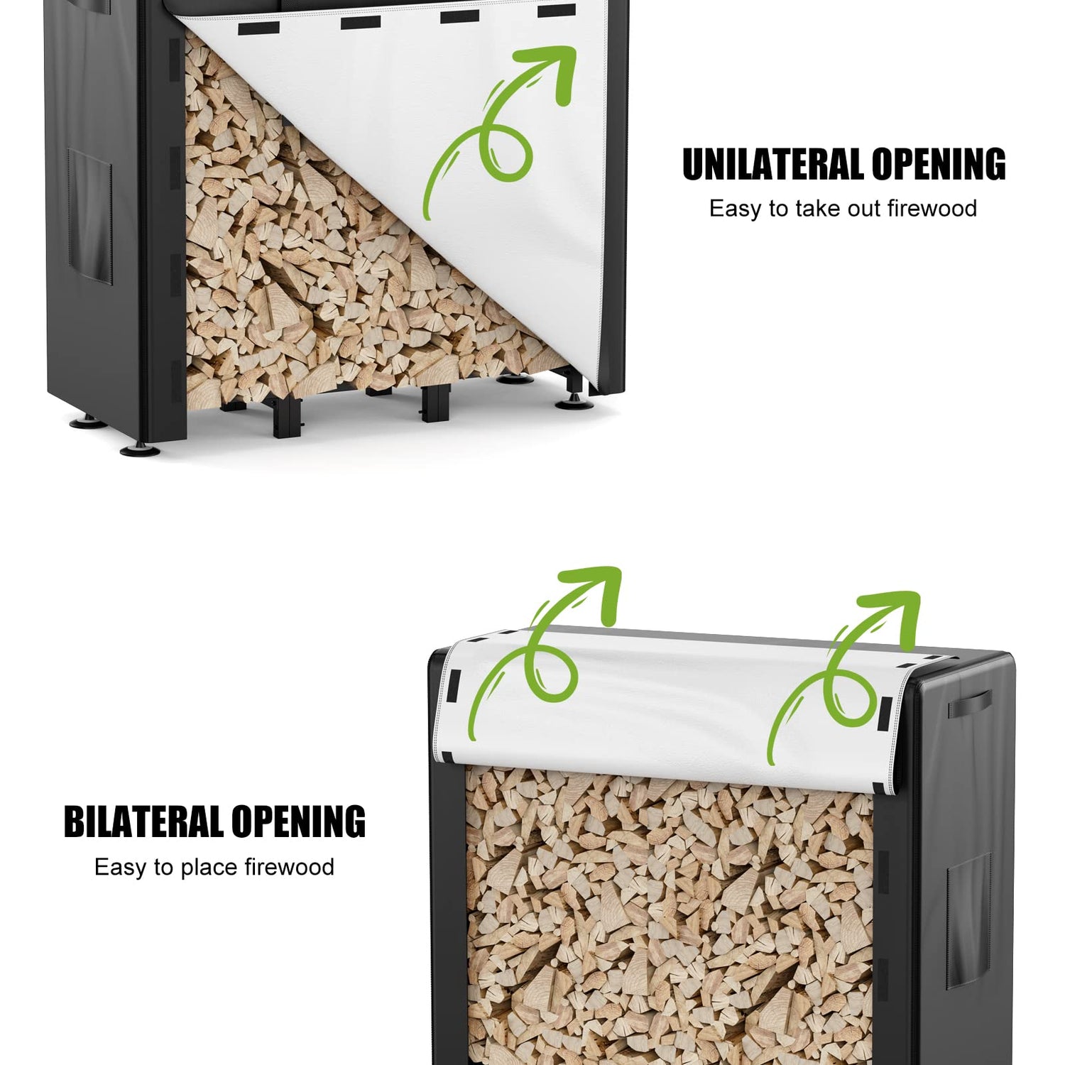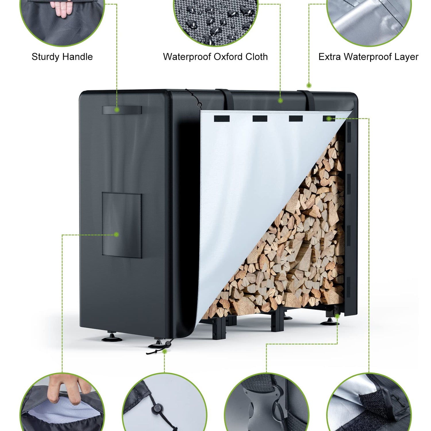 - Professional Wood Rain Cover: UV-resistant coating rain cover of this firewood holder outdoor aims at preventing aging or tearing in harsh weather, inner laid waterproof PU layer and sided air vents will help keeping the dampness out to avoid the firewood from mould and bugs generating or turning black and rotten, better protecting the dry logs to get better burning experience