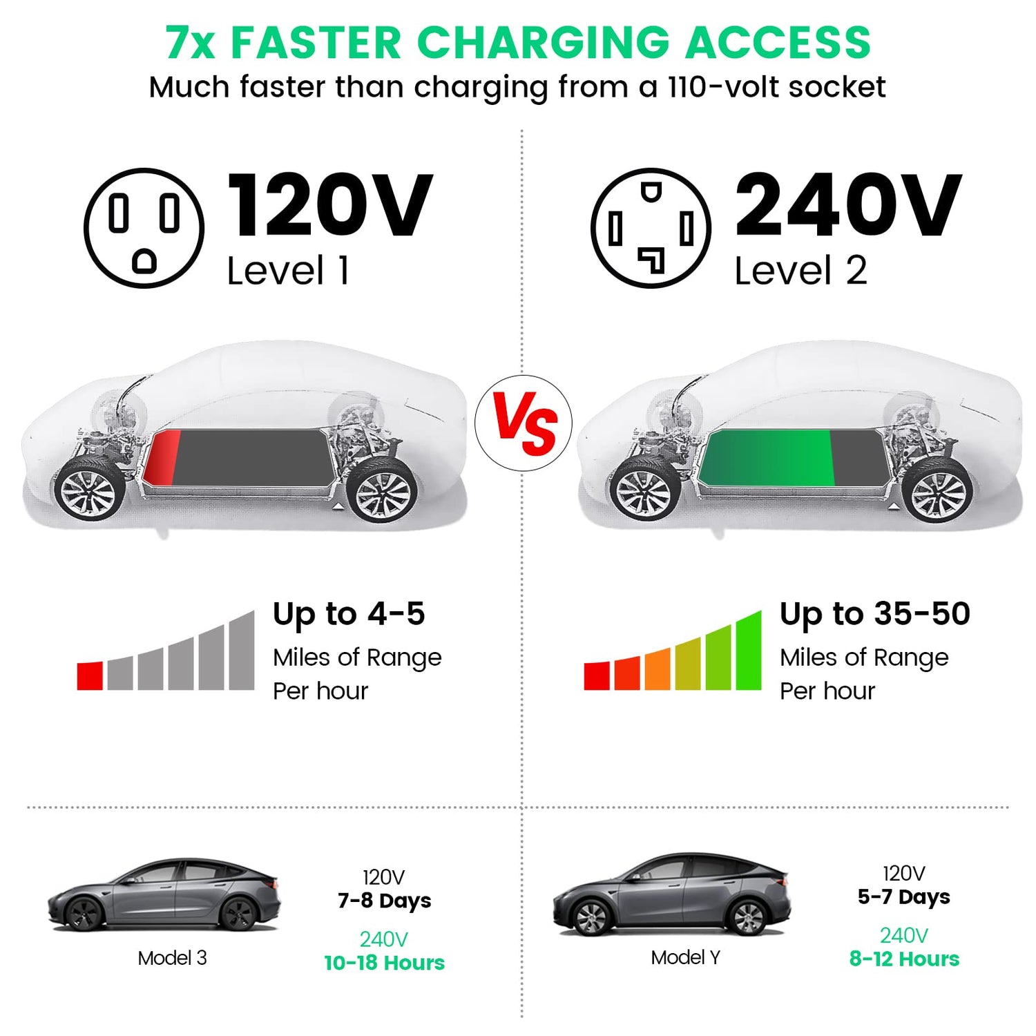 - COMPATIBILITY: Compatible with common electric vehicles and third-party chargers. This unit is built with NEMA 10-30 plug to two NEMA 10-30 outlets. It supports a maximum continuous load of 25 amps, a maximum safe charging rate of 24 amps, and a maximum power of 5.76 KW