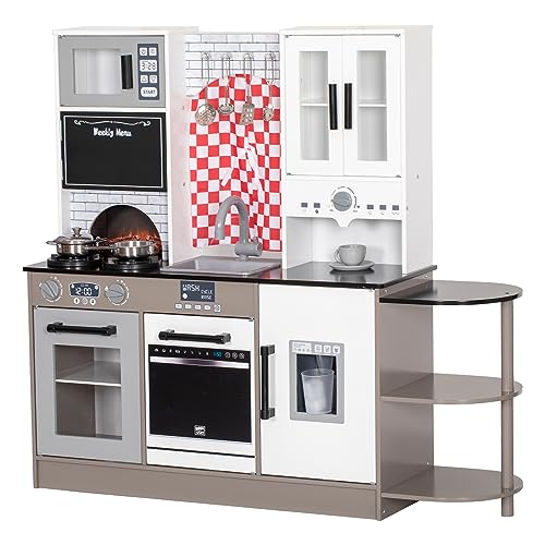 - đăLuxuriant Play FeaturesăFeaturing with a coffee maker, stove, oven, microwave, dishwasher, ice maker, sink and faucet, this kids kitchen playset with multifarious playable features will provide kids with endless fun. A curtain with bright color can be tied on both sides for warm and sweet. We especially designed a fireplace and blackboard to give the rein to kidsâ imagination.