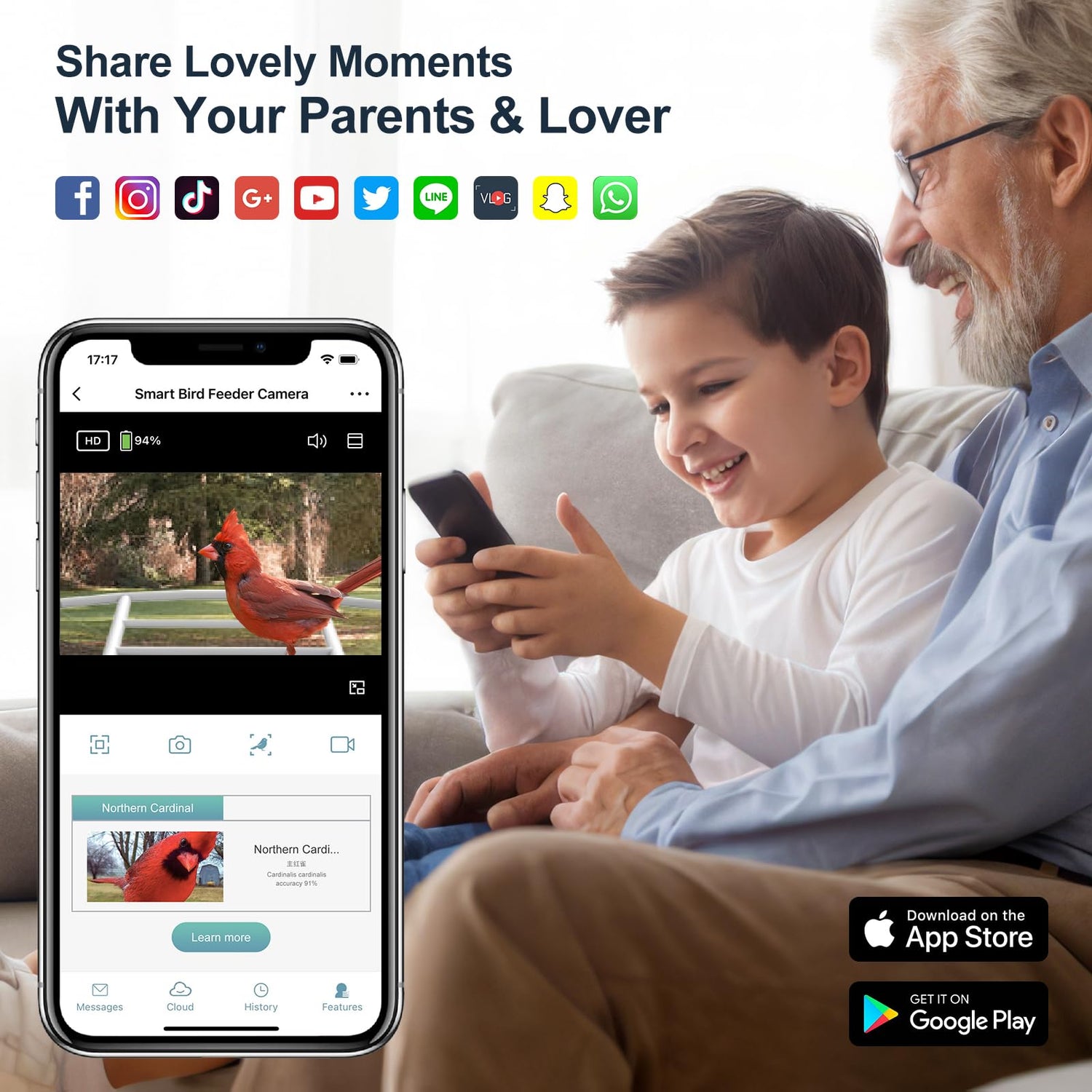 - 【Multiplayer Sharing】 Smart bird feeders can share multiple devices. Support 4 mobile phones to watch online at the same time, as long as there is a network, you can connect and watch anytime, anywhere. Remember to share with family, friends, and partners when you are happy. What's more, a 64G high-speed TF card is included.