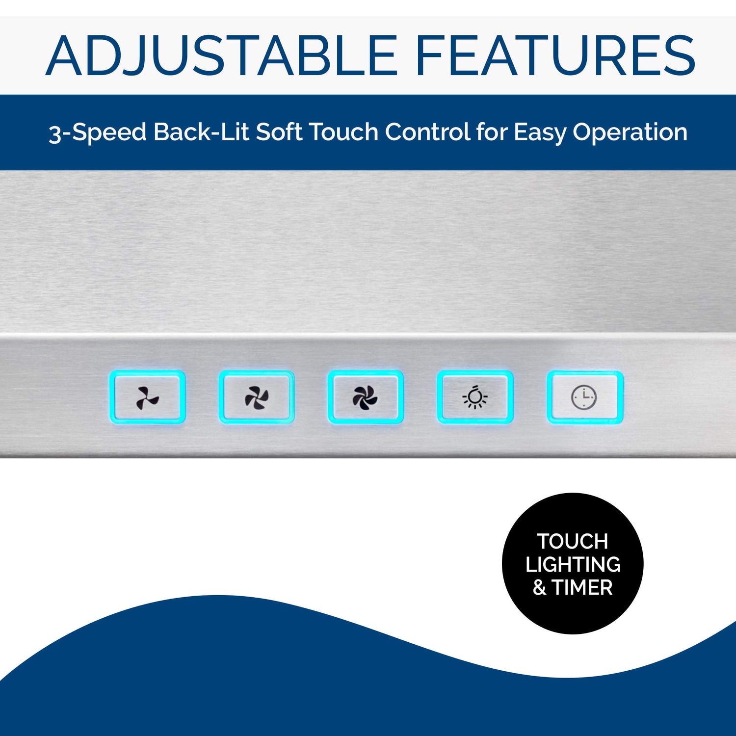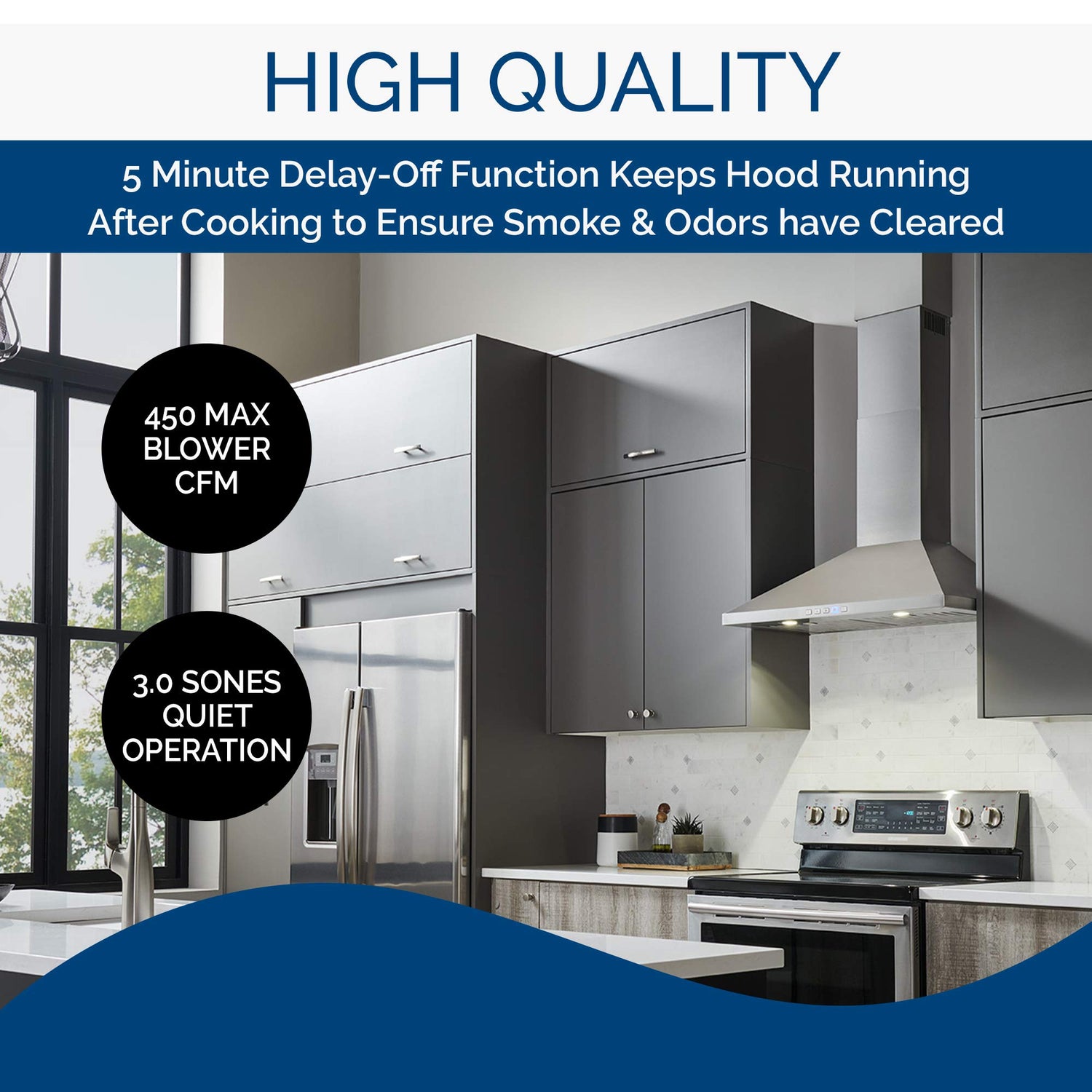 - IMPROVES KITCHEN AIR QUALITY: Provides a MAX 450 CFM and 8.5 Sones performance with a 5 minute delay-off function to remove smoke and cooking odors from the air, and the 3-speed backlit push button controls allow for quick fan adjustments