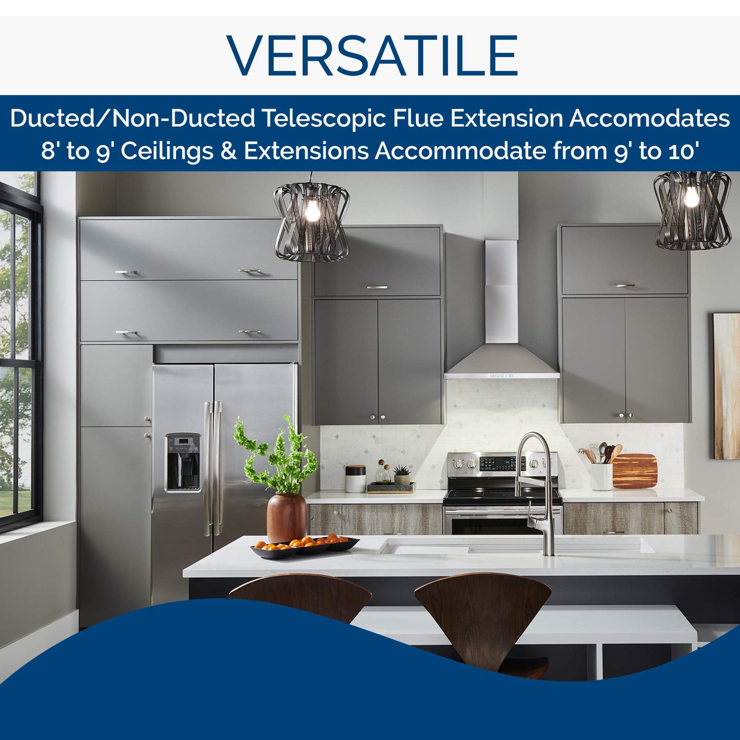 - 30-INCH WALL-MOUNT CHIMNEY RANGE HOOD: Modern pyramidal design mounts neatly to the wall to offer a complete solution to your kitchen ventilation needs by providing both an exhaust fan and overhead light