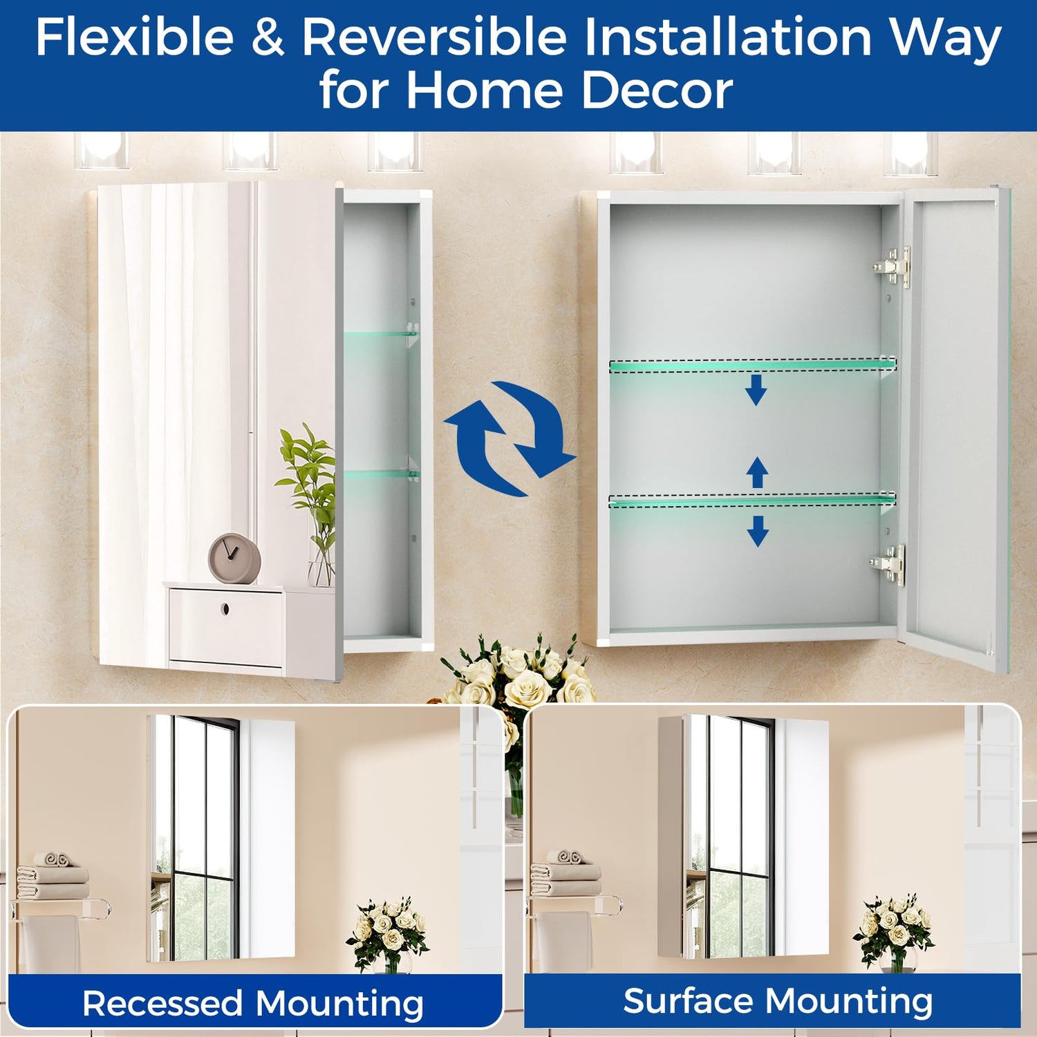 - Surface Mount or Recessed - This bathroom mirror with storage supports both recessed and surface mount.When recessed,please measure the dimensions of the wall cabinet opening in advance.Additionally,you can choose between left-opening or right-opening doors based on spatial layout and personal preference.This bathroom mirror cabinet seamlessly integrates into any bathroom decor style