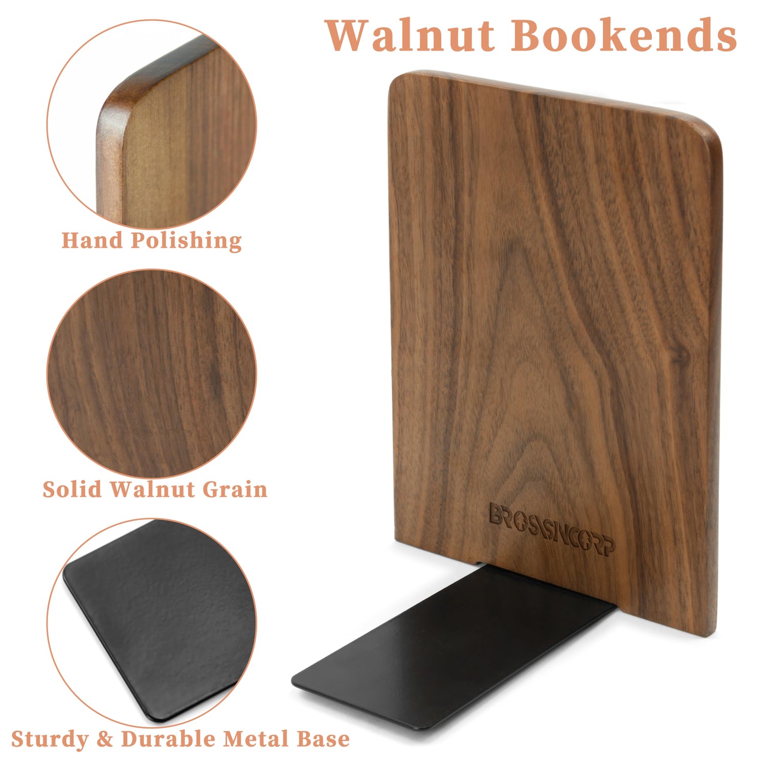 Brosisincorp Walnut Wood Book Ends, Heavy Duty Bookends for Shelves Sturdy Non-Skid Book Stand for CDs - 6.69 x 4.72 x 3.94 in(1 Pairs, Large)