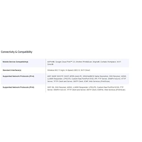Details: Infused with Brother’s latest technology and designed to enhance office efficiency, the Brother HL L2390DW is a reliable, robust, and affordable monochrome laser printer with copying and scanning capabilities that is perfect for the home or small office. The modern and updated replacement for the reliable Brother DCPL2520DW is built with a flatbed scan glass that provides convenient copying and scanning. It has also been updated with new features that allow users to scan and print directly from mobile devices, including tablets, and cloud based accounts. The HL L2390DW has been upgraded to optimize printing to meet the evolving needs of modern business. With lightning quick precision, the Brother monochrome laser printer features a class leading print speed of up to 32 pages per minute. You can easily connect via built in wireless network and USB interfaces and print wireless from your mobile devices. The automatic duplex printing feature helps save paper, and using Brother Genuine high yield replacement toner (TN 760) can help lower print costs (also compatible with TN 730 replacement toner cartridge). The tray with the capacity to hold up to 250 sheets helps improve efficiency with less refills and handles both letter and legal sized paper. Brother is dedicated to superior customer service and stands by our products by offering a 1 year limited warranty on this new monochrome laser printer. We also provide free online, call, or live chat support for the life of your printer. At Brother, we want to ensure that your experience with us is exceptional. If you have been looking for an exceptional monochrome laser printer with fast printing capacity and multiple user friendly features, add the Brother HL L2390DW to your Amazon shopping cart today. (1) Based on competing in class monochrome laser printers under 200 dollars. Print speed specifications gathered from manufacturer websites as of 1/9/2017.(2) Requires connection to a wireless network.(3) TN 760 High Yield vs. TN 730 Standard Yield. Up to two times more prints and lower printing costs based on yields and MSRP. Standard Yield and High yield cartridges sold separately.(4) Approx. toner cartridge yield in accordance with ISO/IEC 19752 (letter/A4).(5) Reprinted from PCMag with permission. Copyright 2017 Ziff Davis, All Rights Reserved.(6) The mobile device must have NFC capability and run Android OS 4.4 or later. Compatibility : ITU T Super Group 3.