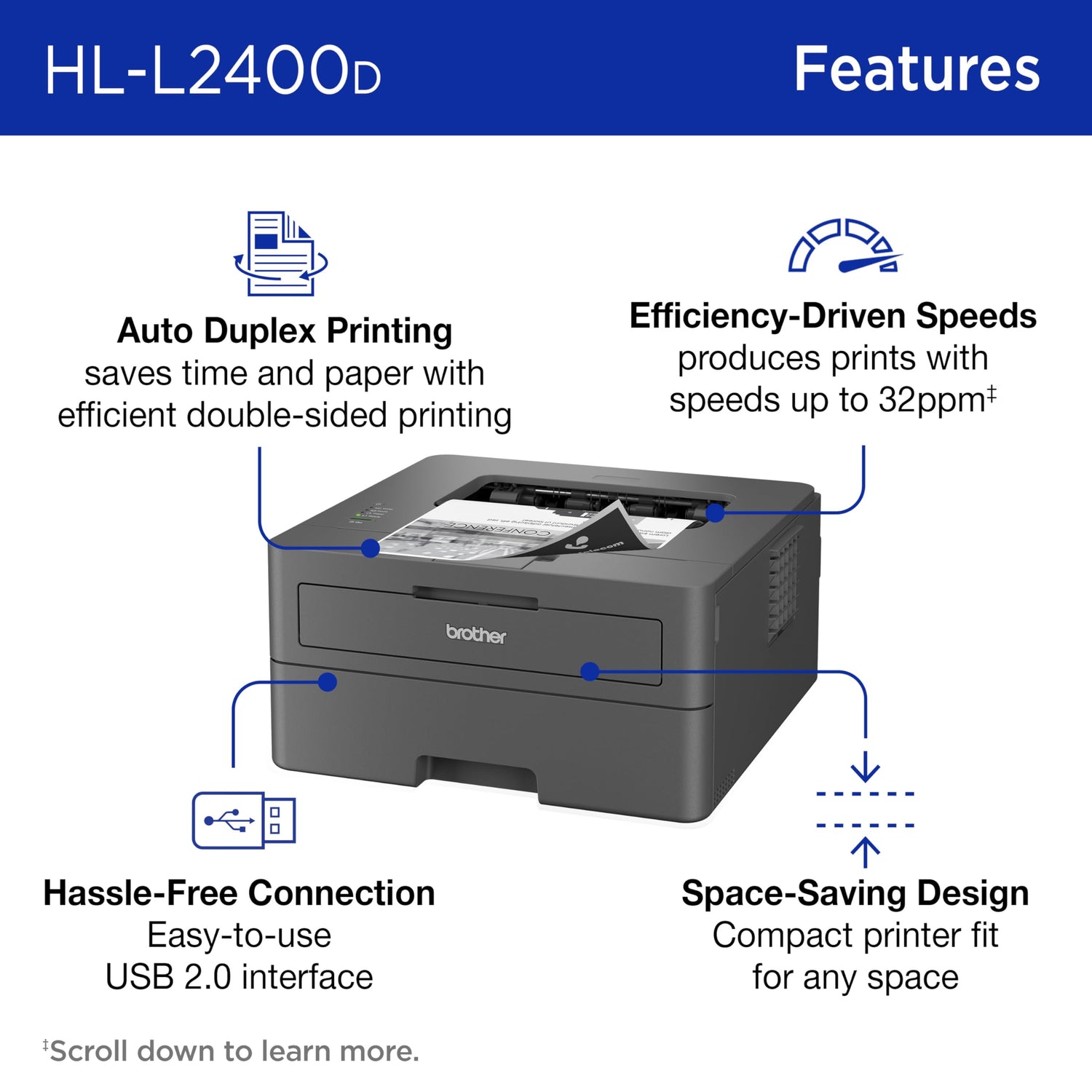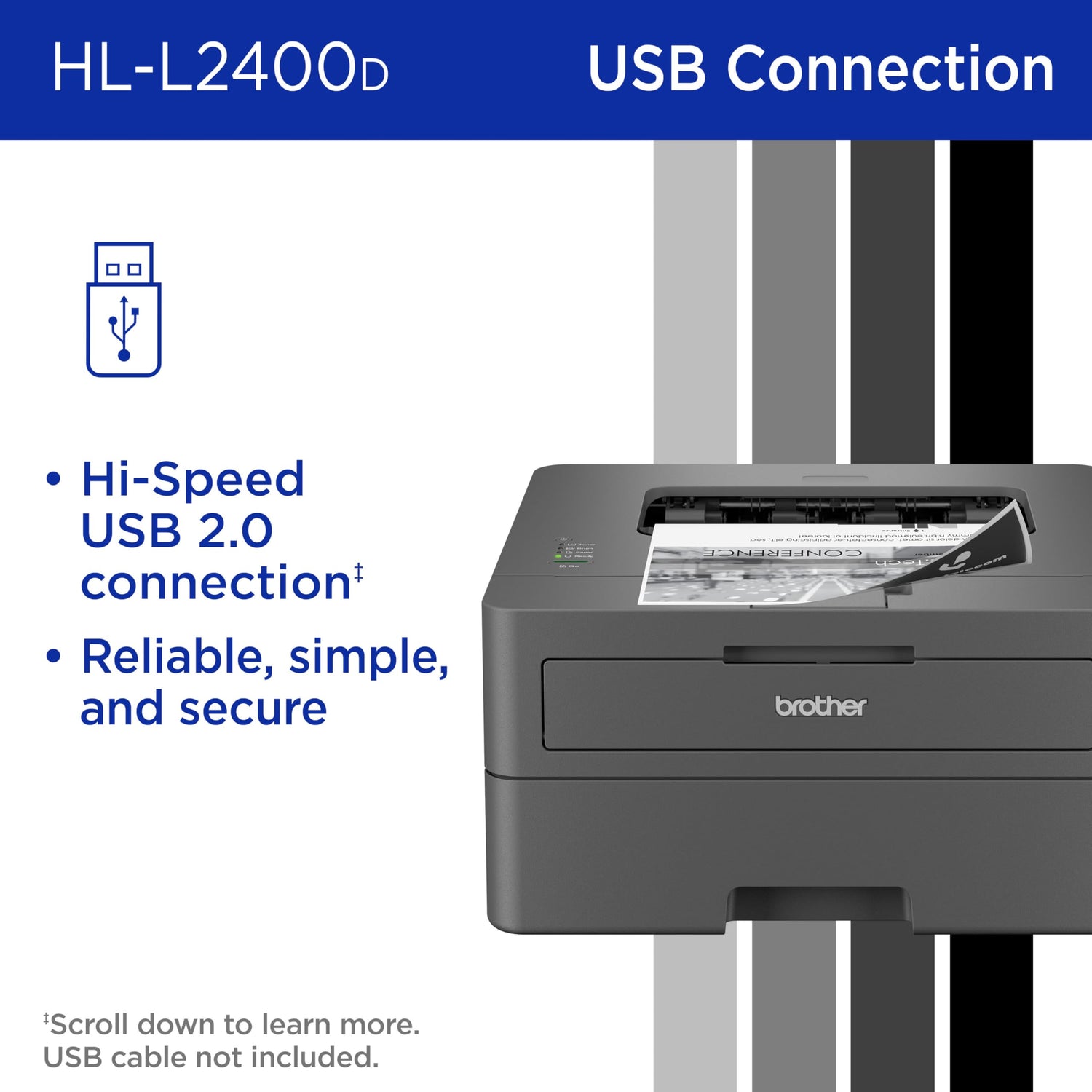 Details: The Brother HL-L2400D Compact Monochrome (Black & White) Laser Printer is the simple, affordable choice for black & white printing. Reliable, quick, and efficient, it consistently produces crisp, easy-to-read black & white prints at speeds up to 32 pages per minute(1) (ppm). The 250-sheet paper tray(2) reduces the frequency of paper refills, while the automatic duplex printing feature saves time and decreases paper waste. The compact footprint of this small printer allows you to place it almost anywhere on your desktop. It connects directly to your preferred device via its Hi-speed USB 2.0 interface.(3) Dependable and cost-effective, this simple, straightforward personal b/w laser printer is an efficient, time-saving addition to any home workspace. Use with Brother Genuine Supplies, expertly engineered by Brother to produce reliably sharp and smudge-free black & white prints in your Brother laser printer: Replacement Toner TN830 (Standard), TN830XL (High Yield), and TN830XL 2PK (Twin-Pack); and Replacement Drum Unit DR830. Disclaimers 1. Based on one-sided printing. Change from default setting required. 2. Maximum capacity based on using 20-lb. paper. 3. USB cable not included. ENERGY STAR and the ENERGY STAR mark are registered trademarks owned by the U.S. Environmental Protection Agency. Images are for illustrative purposes only. Specifications subject to change.
