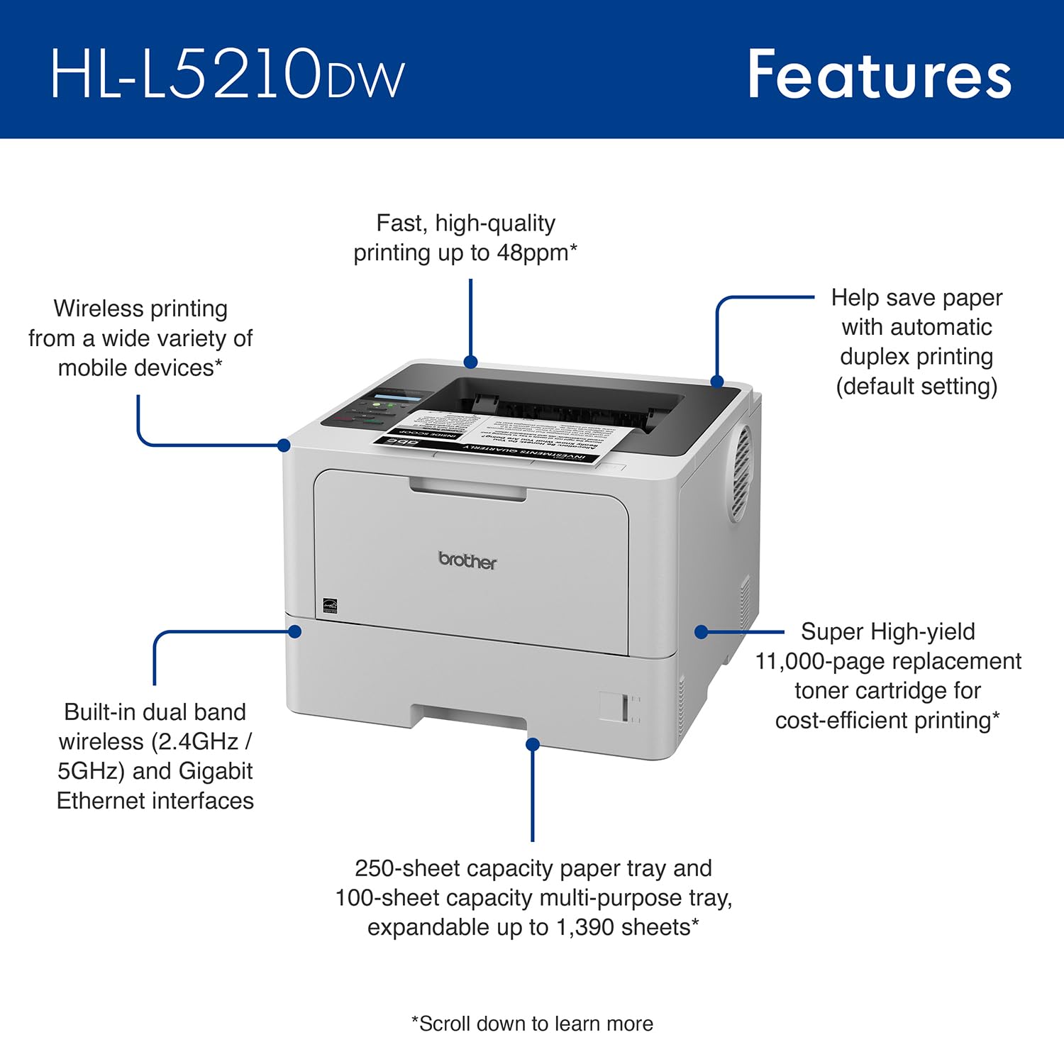 Details: The Brother HL-L5210DW business monochrome laser printer is a great choice for busy offices and small workgroups that need cost-efficient printing, versatile paper handling, advanced security features, and reliable, high-quality output. This high-performance printer helps to increase productivity with a fast print speed of up to 48ppm(1). Delivers cost-efficient printing by using the Brother Genuine TN920XXL super high-yield 11,000-page replacement toner cartridge. Includes a Brother Genuine 3,000-page toner cartridge(2). 250-sheet capacity paper tray is adjustable for letter or legal-sized paper and the 100-sheet capacity multipurpose tray is ideal for printing on custom media or envelopes(3). Total capacity is expandable up to 1,390 sheets with optional trays(4). Features built-in Gigabit Ethernet and dual band wirelessnetworking to seamlessly set up and share on your wired or wireless network. Easily print from a wide variety of mobile devices(5). Triple Layer Security features help to limit document and device access and protect against network intrusions. ENERGY STAR® certified and EPEAT® Silver rated. Help save paper with default duplex printing. Eco Mode helps to reduce power consumption, while Toner Save Mode helps to reduce toner use. One-year limited warranty with free online, live chat, or phone support for the life of your product. 1 Based on one-sided printing. Change from default setting required. 2 Approximate toner cartridge yield in accordance with ISO/IEC 19752 (letter/A4). 3 Maximum capacity based on using 20 lb. paper. 4 Requires additional purchase. 5 Additional download required. Compatibility may vary by device or operating system. Wireless connection may be required