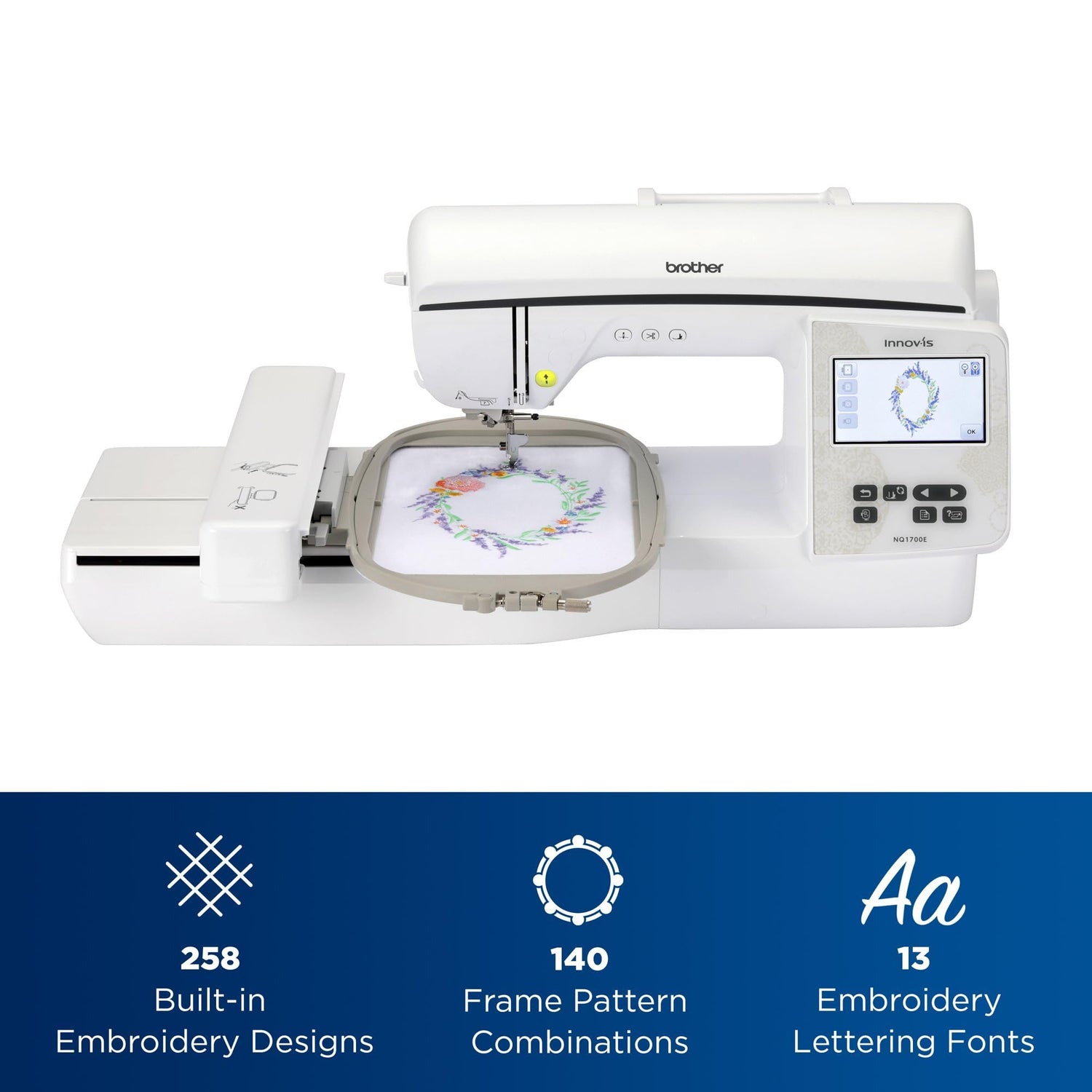 Details: The perfect machine to launch your embroidery journey, the Innov-ís NQ1700E has a host of state-of-the-art features to get you started. With the NQ1700E, you can embellish, enhance,and personalize all of your DIY projects - everything from inviting home décor, chic vintage goods, and more as this affordable machine is ideal for beginners and advanced skill levels. The NQ1700E comes with 258 built-in embroidery designs, featuring 140 frame pattern combinations and 13 embroidery lettering fonts to keep your inspiration growing. When large projects are on the plan, you can use the 2 included standard frames (6" x 10" and 5" x 7") and the built-in frame designs (10 Shapes x 14 Stitch Patterns) plus a generous 6" x 10" embroidery area so you can easily maneuver fabric when you're working. When connected to a wireless network, send designs to your machine using Design Database Transfer (no USB needed) and edit your creations on the generous 4.85" color LCD touch screen display. This super bright, vivid color touch screen displays all your embroidery functions such as on-screen editing, enhanced zoom, resizing, rotating, repositioning, drag and drop, and combining designs, all right at your fingertips. A host of inspiring features such as an Auto Presser Foot (down to start), Automatic Thread Cutting, and an advanced Automatic Thread Trimming System will increase your productivity. And embroidery speeds of up to 850 stitches per minute, and the illuminating LED lights will keep you creating. With a sleek white exterior (with subtle grey accents) and an impressive opening montage of inspiring projects, now is the time to start your embroidery journey with the Innov-ís NQ1700E.