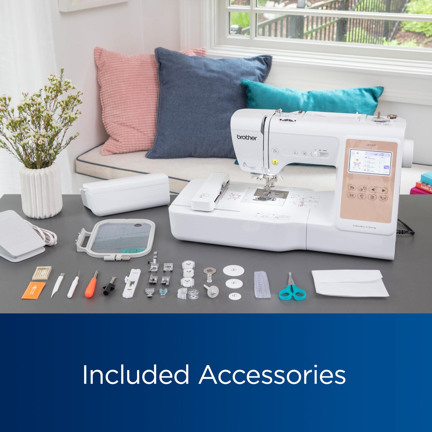 Details: The LB5500 2-in-1 Sewing and Embroidery machine allows you to embroider and sew easily. View the 135 built-in embroidery designs, 103 built-in sewing stitches, and 10 built-in lettering fonts for all your projects on the sharp 3.7" LCD display, which has easy on-screen editing. A sizable 6.4" x 4.0" work area and a generous embroidery area of 4" x 4" will assist in all your DIY projects. When connected to a wireless network (wireless LAN enabled), the LB5500 lets you send files from your PC to your machine via Design Database Transfer (no USB required), so you can send and then stitch! This free downloadable software allows for easy data management for all your designs. You can also create and send designs through PE-Design 111/2 for added flexibility. A vital feature of the LB5500 is the new Artspira App. This new feature has embroidery patterns you can download, plus the ability to create embroidery patterns by drawing on your mobile device. The drawing tools embedded in the app include a pen (single/zigzag), shapes, and an eraser. You can draw line-art inspired designs up to 4" x 4" (100mm x 100mm) and then transfer them to your LB5500 wirelessly. The Artspira App lets you share your creations on many social media platforms as well. The LB5500 has an advanced needle threading system and an automatic thread cutter, sewing speeds up to 710 spm, and legendary Brother reliability, so creating your next customized project can be effortless. With a 6.4" x 4.0" work area and a maximum embroidery area of 4" x 4", making children's clothes, doing minor apparel repairs, and even creating warm home décor can be achieved. The 2-in-1 sewing and embroidery LB5500 Sewing and Embroidery machine has innovative technology and state-of-the-art features that will look great in any sewing room.