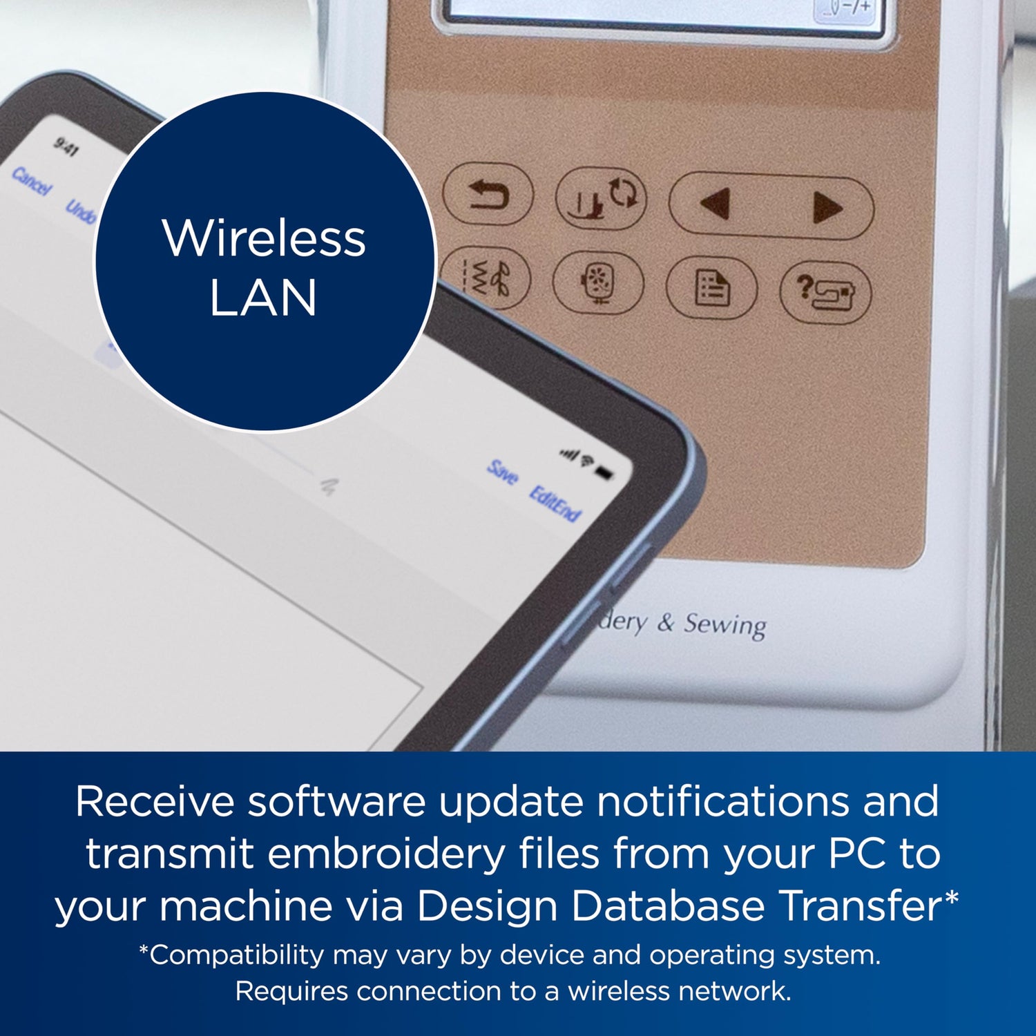 - Wireless LAN: With wireless LAN enabled, the LB5500 will send you software update notifications and will let you to transmit embroidery files from your PC to your machine via the free downloadable software Design Database Transfer 1 (no USB required). This allows for easy data management for all your designs and projects.