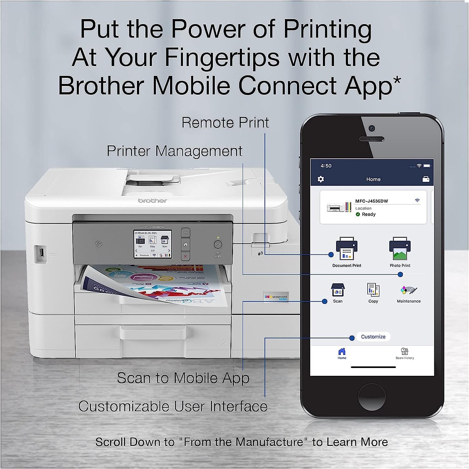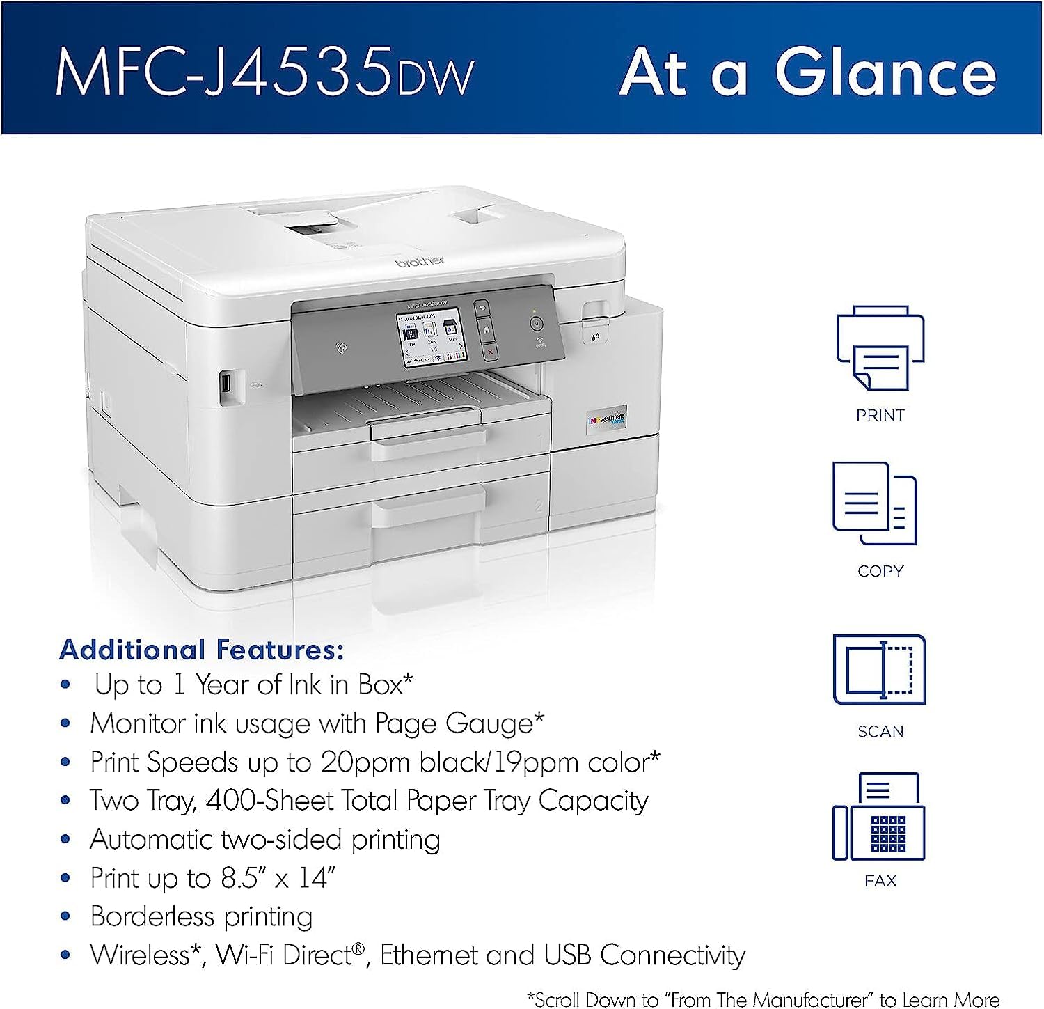 - Print, copy, scan, and fax functionality, a generous 2.7" touchscreen display, and two adjustable paper trays for up to a 400-page total capacity help make the Brother MFC-J4535DWC all-in-one color inkjet printer the ultimate INKvestment Tank printer for your home, home office, schoolwork, or small business.