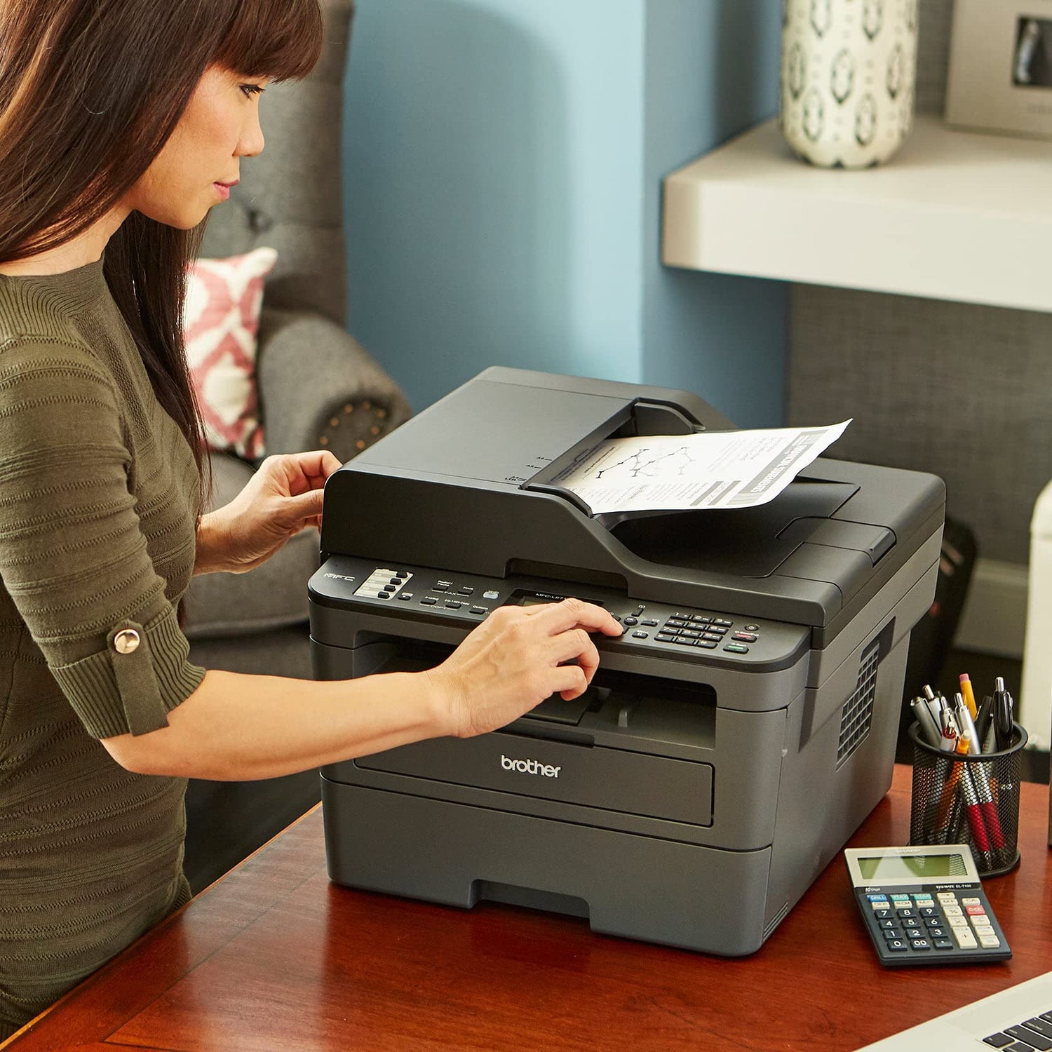 The Brother MFC-L2690DW monochrome all-in-one laser printer delivers full-featured performance for busy home or small offices that need full functionality in a compact, desk-friendly footprint. Its fast print speeds of up to 26 pages per minute + plus automatic duplex (2-sided) printing provide increased efficiency and let you spend less time printing, leaving you more time for running your business. Flexible connectivity options include wireless networking that enables printing from mobile devices, sharing with multiple users on your network or connecting locally to a single computer via USB interface. The 250-sheet capacity adjustable paper tray helps improve efficiency with less refills and handles letter or legal sized paper while the 50-page capacity automatic document feeder enables multi-page copying and scanning