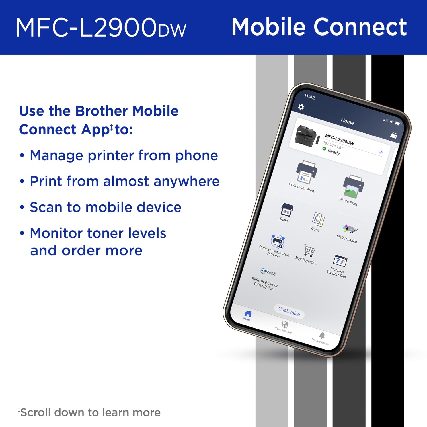 - FLEXIBLE CONNECTION OPTIONS – Connect with built-in dual-band wireless (2.4GHz / 5GHz), Ethernet, or locally to a single computer via USB interface. Print, scan, and manage your printer from your mobile device with the Brother Mobile Connect app(5)