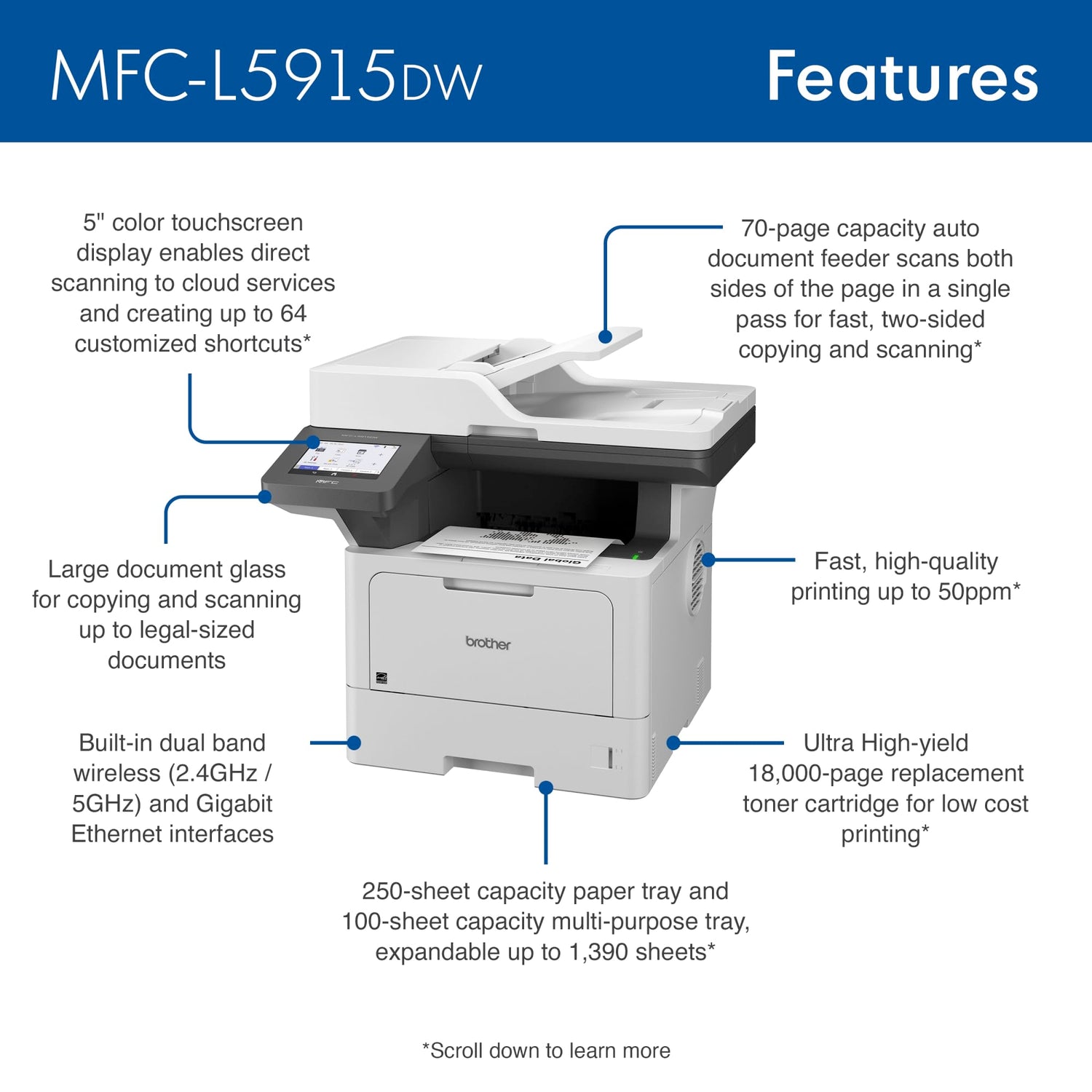 Details: The Brother MFC-L5915DW business monochrome laser all-in-one printer is a great choice for busy offices and workgroups with higher print volumes that need fast, high-quality output, lowcost printing, versatile paper handling, and advanced security features. This high-performance all-in-one printer helps to increase productivity with fast print and copy speeds up to 50ppm1 . Delivers low-cost printing by using the Brother Genuine TN920UXXL ultra high-yield replacement toner cartridge. Triple Layer Security features help to limit document and device access and protect against network intrusions. Offers expandable paper capacity that is scalable as your business needs grow. Quickly scan multi-page documents to a wide variety of destinations using the 70-page capacity2 auto document feeder. The 5” touchscreen display allows for the creation of customized shortcuts to your most frequently used workflows. The MFC-L5915DW also provides flexible connectivity with built-in Gigabit Ethernet and dual band wireless networking, plus convenient mobile device printing to meet mobile workforce demands3 .