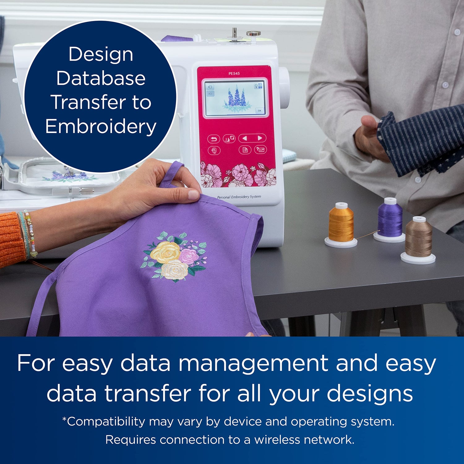 - WIRELESS LAN ENABLED: Transmit embroidery files from your PC to your embroidery machine via the free downloadable software Design Database Transfer(1), or connect via the built-in USB port