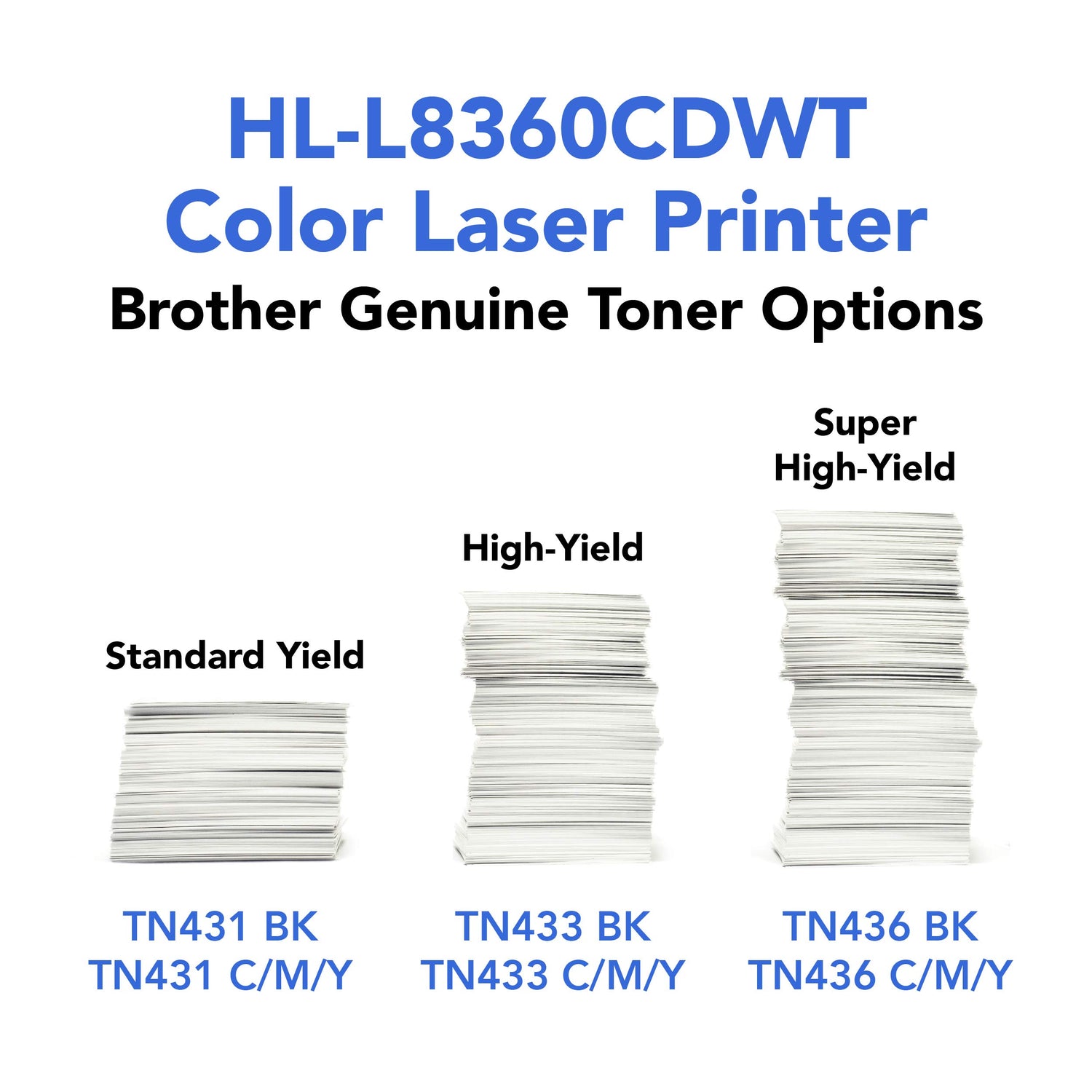Details: For businesses that require a dependable and cost-efficient color laser printer with a large paper capacity, the Brother HL-L8360CDWT is the solution. Arriving with dual paper trays, (250- and 500-sheet capacities), this business color laser printer produces both black and color pages at print speeds up to 33 pages per minute. (1) An additional 50-sheet capacity multi-purpose tray for printing envelopes and additional media increases the total capacity to 800 pages. The built-in automatic duplex printing feature reduces your printing costs while producing professional-looking two-sided documents, brochures, presentations, and booklets. Connecting to the Brother HL-L8360CDWT is simple and convenient. Built in wireless and Gigabit Ethernet interfaces allows users to share the printer with others on their network. Users can also easily print from their mobile devices. (2) An adjustable 2. 7″ Touchscreen display offers easy menu navigation and printing from Google Drive, Dropbox, OneDrive, and more. (5) This printer also has advanced security features, an NFC card-reader allows for easy badge authentication, and Active Directory support, which allows for network user authentication. The Brother HL-L8360CDWT color office laser printer is also Dash Replenishment–enabled. When you activate this feature, Dash Replenishment will continuously measure the toner level and order more from when it’s low. This unique Brother feature keeps busy office workspaces operating at peak efficiency, ensuring you don’t run out of toner. (1)Based on one-sided printing. Change from default setting required. (2)Requires connection to a wireless network. (3)Approximate cartridge yield in accordance with ISO/IEC 19798 (letter/A4). (4)The mobile device must have NFC capability and run Android OS 4. 4 or later. (5)Requires an Internet connection and an account with desired service.