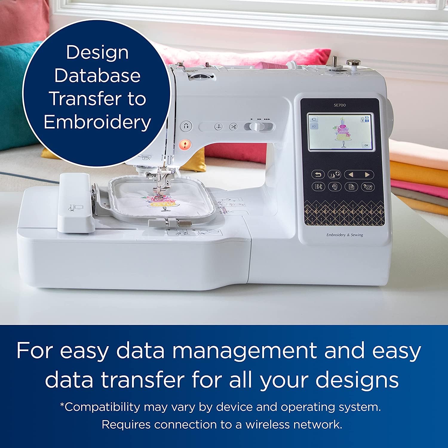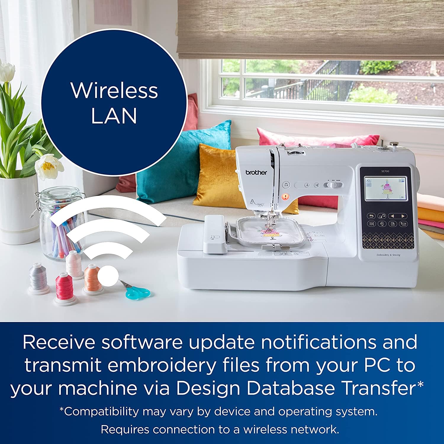 - WIRELESS LAN ENABLED: Transmit embroidery files from your PC to your sewing and embroidery machine via the free downloadable software Design Database Transfer(1), or connect via the built-in USB port
