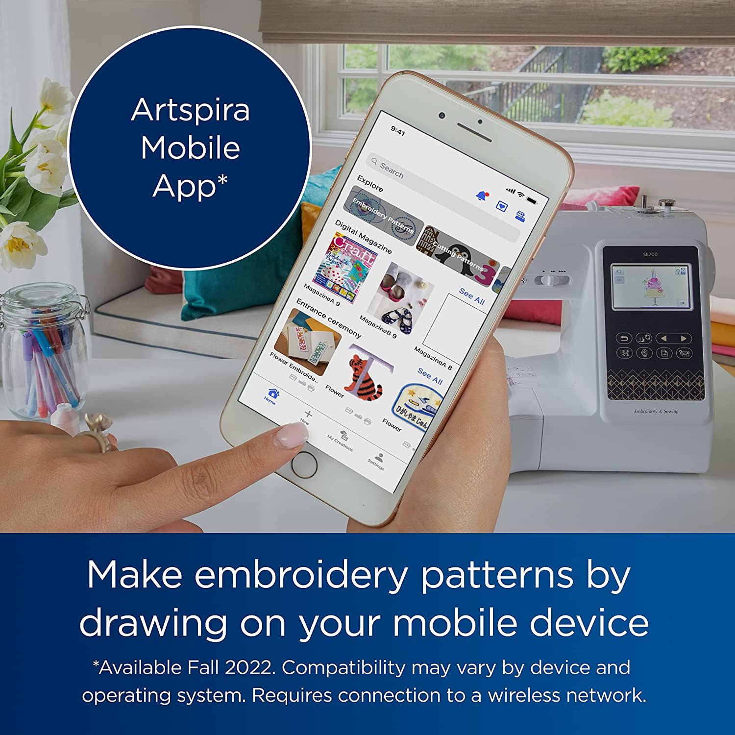 - ARTSPIRA MOBILE APP: Make custom embroidery patterns by drawing on your mobile device, or download patterns from the collection and transfer them to your SE700 wirelessly