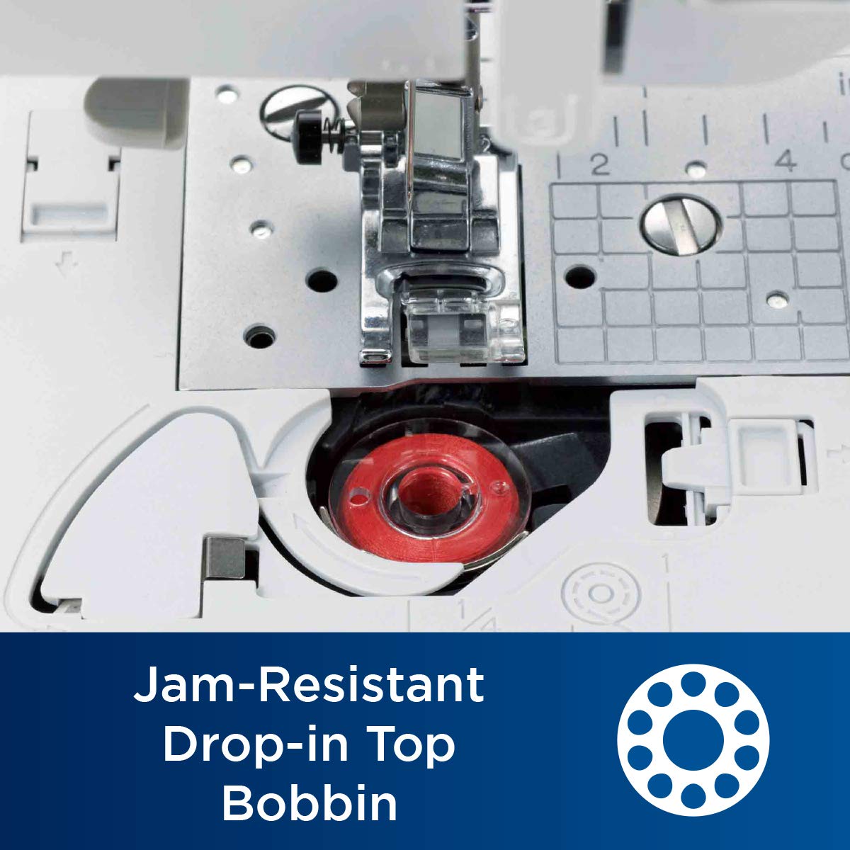 - Advanced needle threader and drop-in top bobbin: This sewing machine includes an advanced needle threading function that easily pushes the thread through the needle with the press of a lever and a jam resistant drop-in top bobbin
