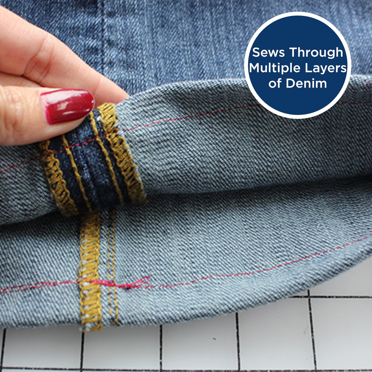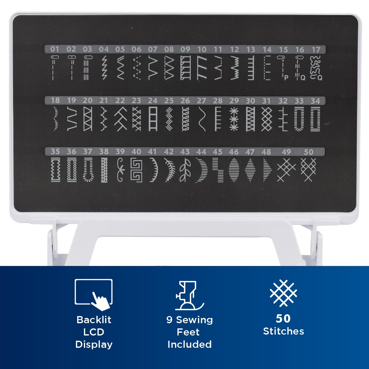 Details: Sew on everything from multiple layers of heavyweight fabrics and denim to lightweight silks. 50 built-in sewing stitches, including decorative stitches and 5 styles of one-step, auto-sized buttonholes. Longer 7-point feed dogs with box feed design help provide smoother fabric feeding even with tough projects. The right and left feed dogs grab your fabric securely while the center feed dog holds the thread, for superior stitching and feeding. Included walking foot holds and moves the fabric between the foot’s upper feed dog and the machine’s lower feed dogs to better control difficult fabrics and multiple fabric layers. Expanded 6. 4” w x 4. 1" h needle-to-arm workspace provides more room for quilts and bulkier sewing projects. Includes two #14 heavy duty needles for sewing heavier fabrics such as jeans and leather, in addition to two No.11 needles for light to medium weight fabrics and two No.14 ballpoint needles for knits and other stretch fabrics. Super wide stitch selection, with up to 7mm stitch width. Variable speed control allows you to sew at your desired speed. Start/stop and needle up/down buttons give you added control over your sewing, and are extremely useful when pivoting. One-step drop feed button for free-motion sewing. 9 sewing feet, with walking, ¼” piecing, buttonhole, overcasting, monogramming, zipper, spring action zigzag, blind stitch, button sewing feet. Clear-view bobbin cover and bobbin allow you to see when the bobbin is running low on thread. Quick-set bobbin system makes it easy to insert your bobbinch Automatic bobbin winding system produces an evenly wound bobbin for optimal sewing. Sew with or without the included foot pedal. 25-year limited with free customer phone technical support for the life of your product.