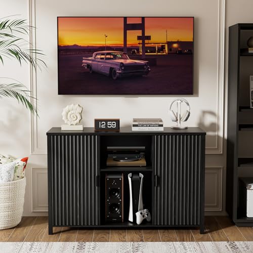 BROTTAR Large Record Player Stand with Vinyl Storage, 47" Wood Turntable Stand with Open Shelves and Fluted Doors, Vinyl Record Storage Cabinet Holds Up to 480 Albums for Music Room Living Room, Black