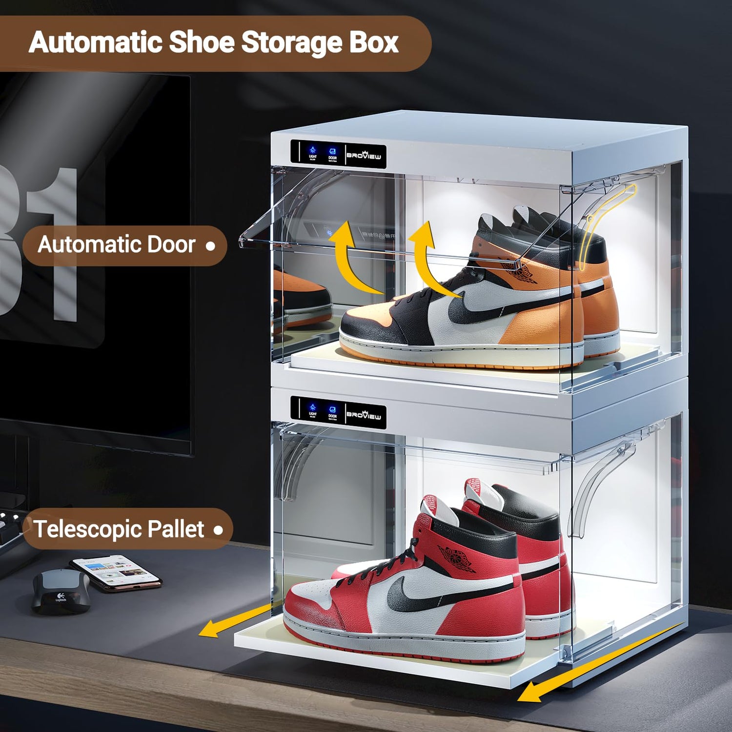 - 【Transparent Automatic Door】The S5 shoe box features doors and side panels made of high-transparent material, providing a clear display for your favorite shoes or collectibles. The automatic door and sliding tray design allow for easy access to your shoes while keeping them protected from dust and moisture, ensuring they stay clean and well-maintained.