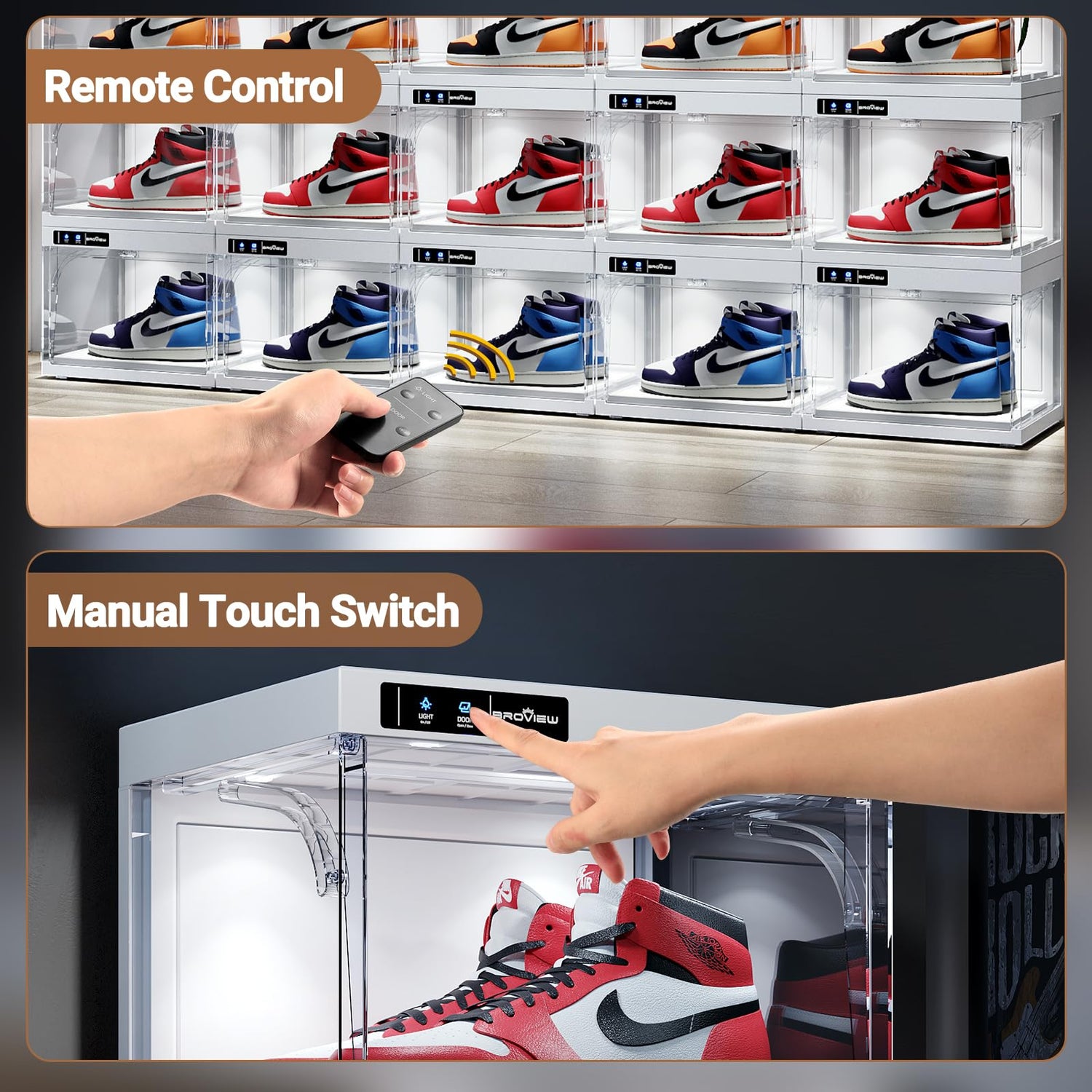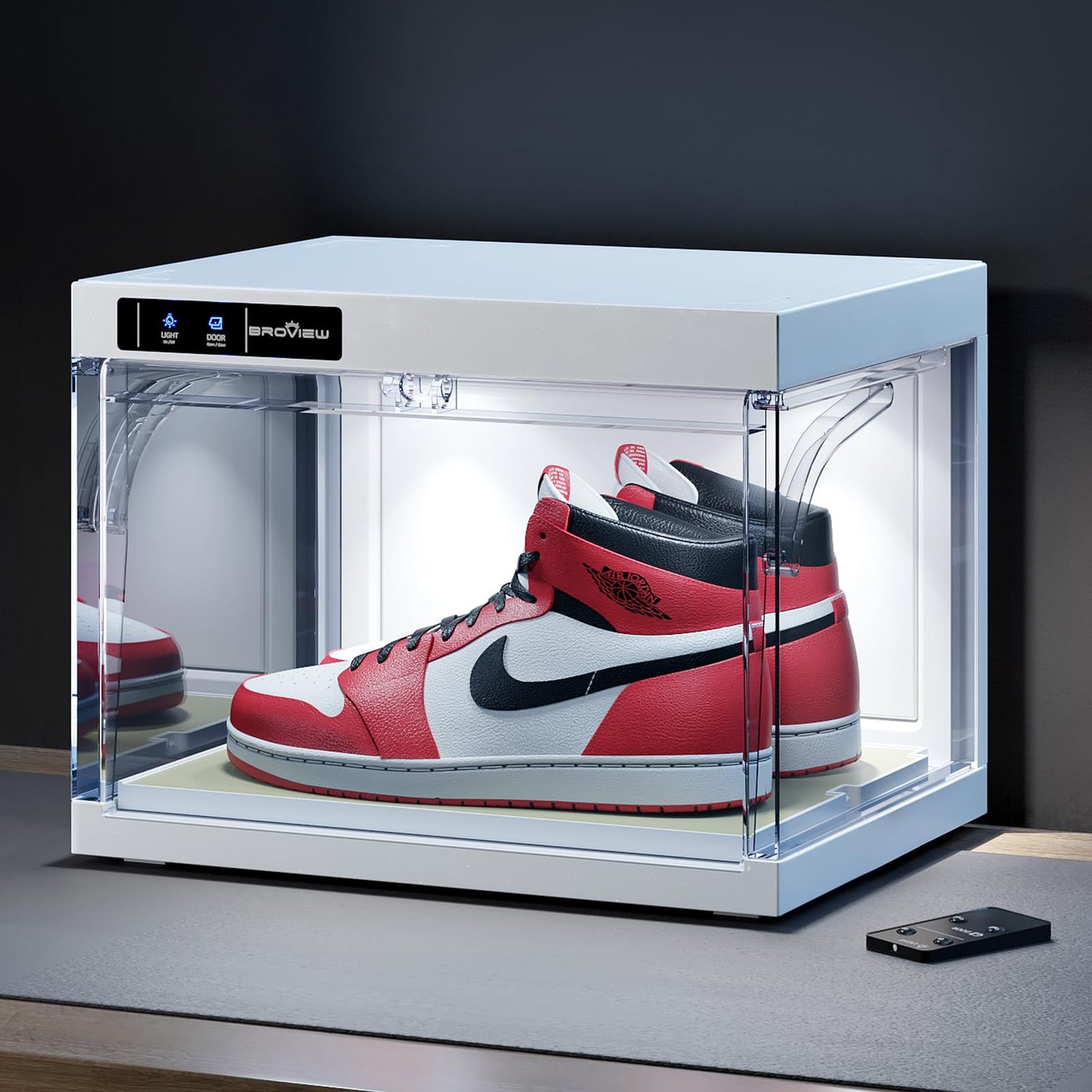 BROVIEW Smart Shoe Display Box with Led Lights, Clear Plastic Stackable Shoe Storage Box, Auto-Opening Shoe Organizer Sneaker Case, Remote Control LED Shoe Boxes, Collection Crate, 1 Pack White